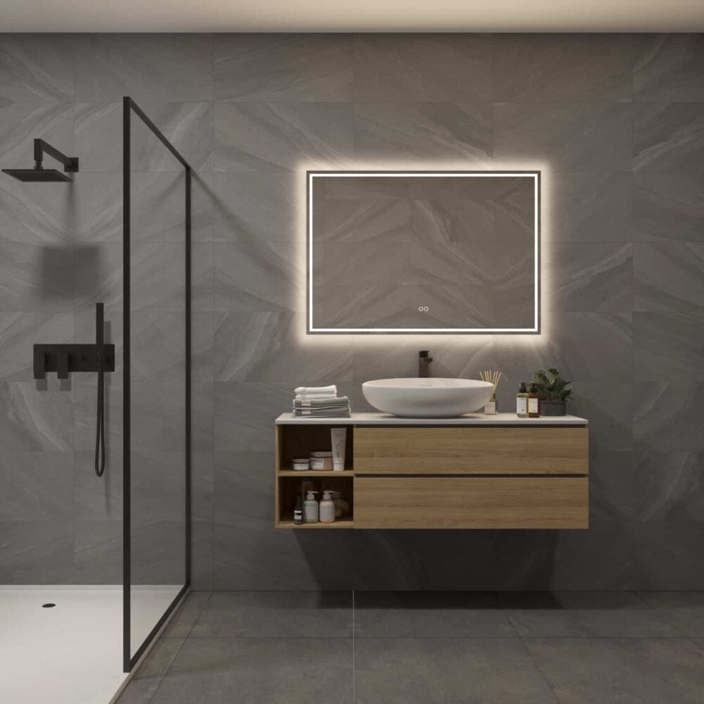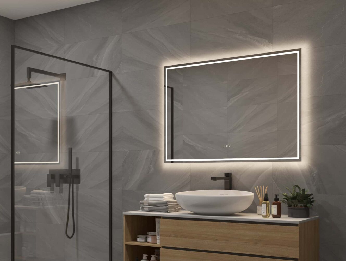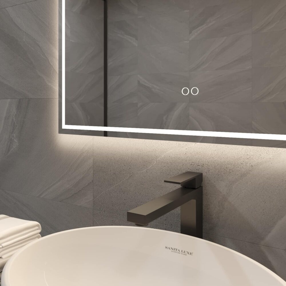 De spiegel is van alle gemakken voorzien, zoals: rondom directe en indirecte verlichting, spiegelverwarming en een dubbele touch schakelaar waarmee zowel de lichtkleur als lichtsterkte kan worden ingesteld.