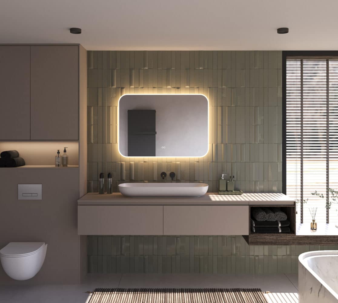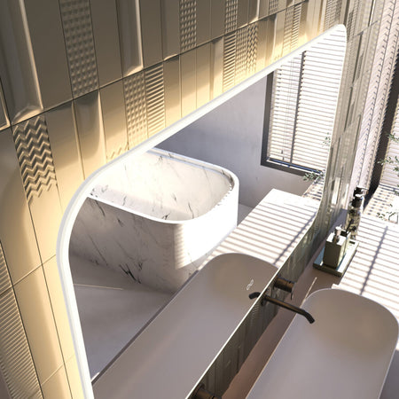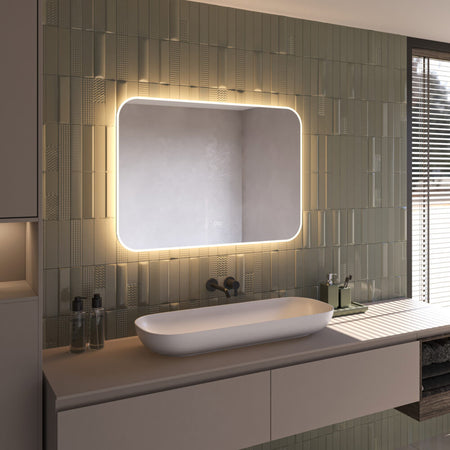 Stijlvolle, moderne badkamerspiegel met afgeronde hoeken in de afmeting 100 cm breed, 70 cm hoog en slechts 3 cm diep.