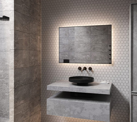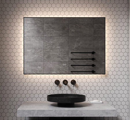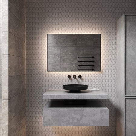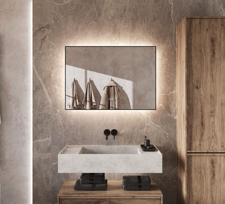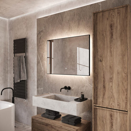 Deze luxe, mat zwarte spiegel is 100 cm breed, 70 cm hoog en voorzien van rondom indirecte verlichting en spiegelverwarming. De dimbare verlichting schijnt vanachter de spiegel rondom en sfeervol over de wand.