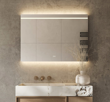 Deze badkamer spiegel is 100 cm breed, 70 cm hoog en van alle gemakken voorzien, zoals: verlichting aan de bovenzijde, sfeerverlichting aan de boven- en onderzijde, spiegelverwarming, handige dimfunctie en zelfs de kleur van de verlichting kan worden ingesteld van warm wit tot koud wit (2700K-6500K).