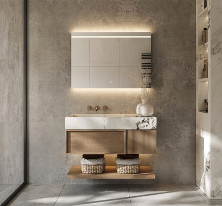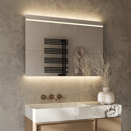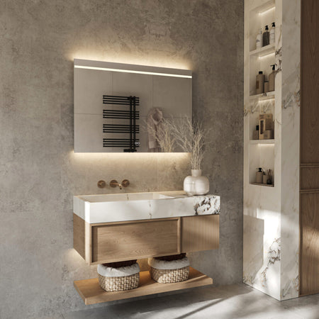 De directe verlichting is horizontaal aan de boven geplaatst en zorgt voor licht naar voren, terwijl de indirecte verlichting achter de spiegel sfeervol over de wand en het badkamermeubel schijnt.