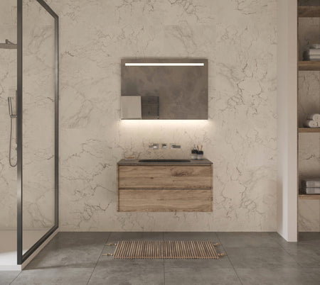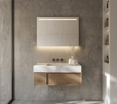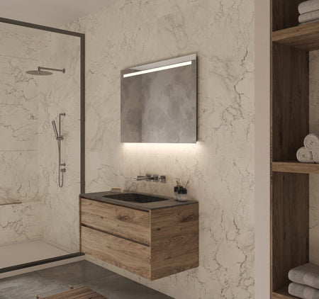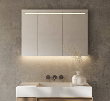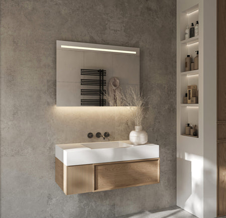 Deze 100 cm brede spiegel is aan de bovenzijde voorzien van een 2,5 cm brede lichtbalk voor praktische verlichting in het gezicht. De ambient verlichting aan de onderzijde schijnt fraai over de wand en zorgt voor veel sfeer in de badkamer.