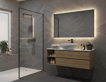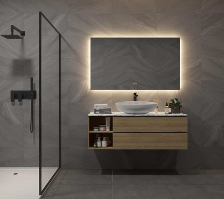 Deze complete badkamer spiegel van 120 cm breed en 70 cm hoog is van alle gemakken voorzien. De dimbare verlichting schijnt vanachter de spiegel sfeervol over de wand. De lichtkleur kan naar wens worden ingesteld, handig!