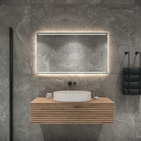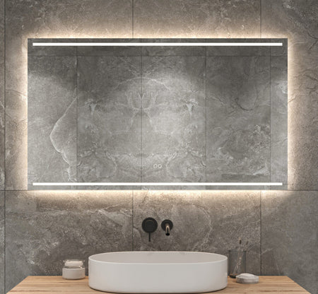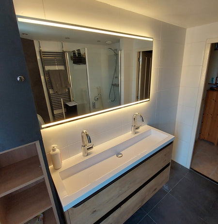 Deze badkamer spiegel is 120 cm breed, 70 cm hoog en slechts 3 cm diep. De indirecte verlichting schijnt vanachter de spiegel fraai over de wand. De horizontale verlichting aan de boven- en onderzijde van de spiegel zorgt voor een praktisch licht in het gezicht en tevens voor veel omgevingslicht.