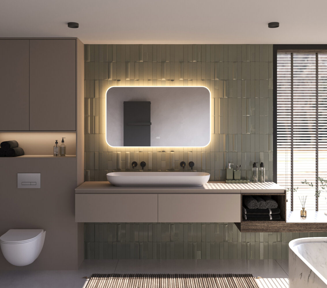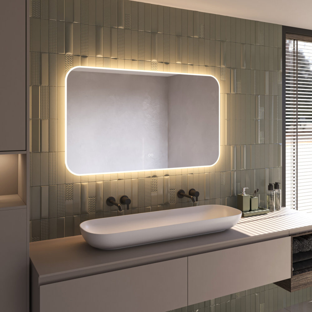 Stijlvolle, moderne badkamerspiegel met afgeronde hoeken in de afmeting 120 cm breed, 70 cm hoog en slechts 3 cm diep.