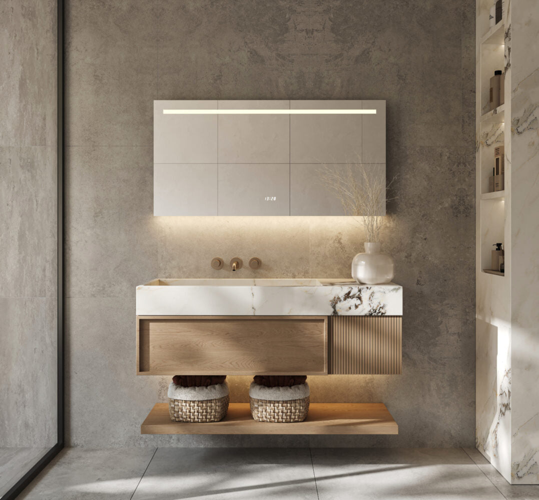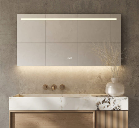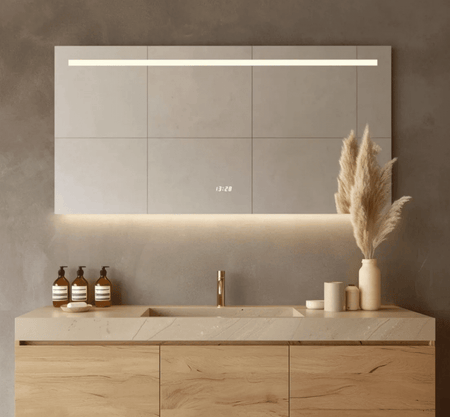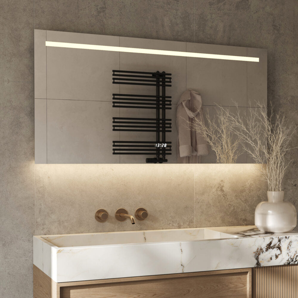 Deze fraaie badkamer spiegel is 120 cm breed, 70 cm hoog en slechts 3 cm diep. De aanwezige opties zijn een witte digitale klok, spiegelverwarming, een sensor met dimmer en verlichting, kortom heel compleet!