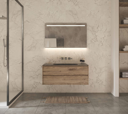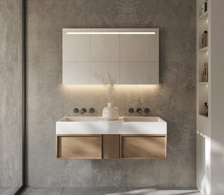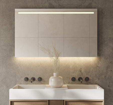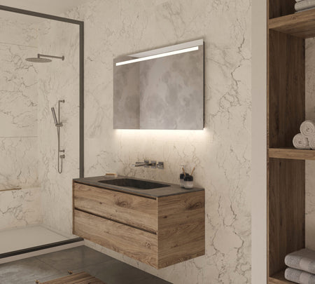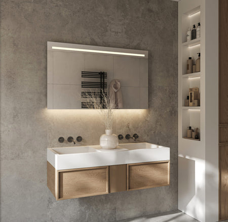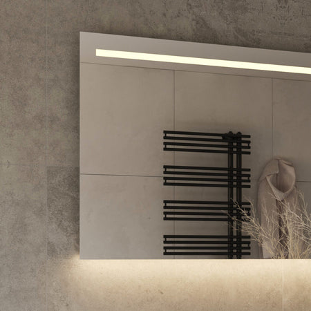 Deze 120×70 cm badkamer spiegel is aan de bovenzijde voorzien van een 2,5 cm brede lichtbalk voor praktische verlichting in het gezicht. De ambient verlichting aan de onderzijde schijnt fraai over de wand en zorgt voor veel sfeer in de badkamer.