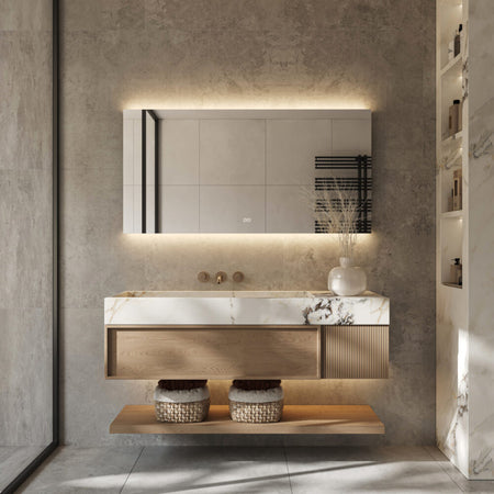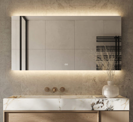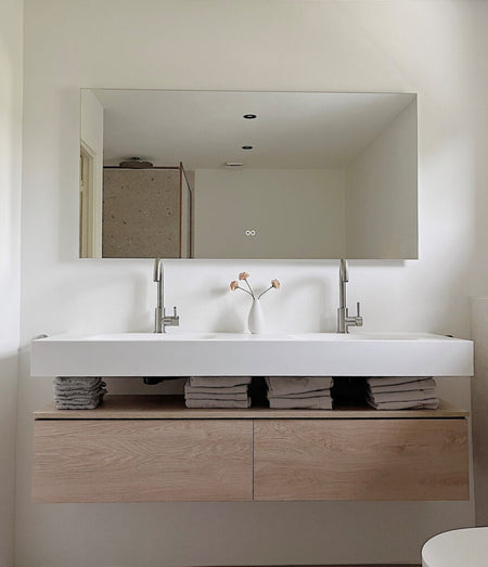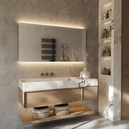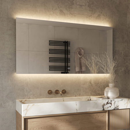 Deze brede badkamer spiegel van 140 cm breed en 70 cm hoog is van alle gemakken voorzien. Zo zijn er 2 stopcontacten geïntegreerd; 1 aan de linker zijde en 1 aan de rechter zijde. Daarnaast beschikt deze spiegel over spiegelverwarming en dimbare indirecte/ ambient verlichting aan de boven- en onderzijde, waarbij de lichtkleur instelbaar is tussen warm wit en koud wit, handig!