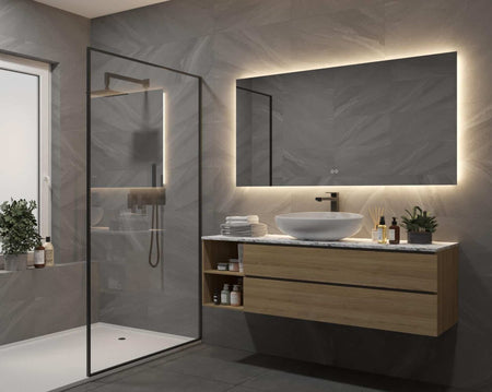 Deze complete LED spiegel geeft veel sfeer in de badkamer dankzij de rondom geplaatste verlichting. De dimbare LED verlichting ligt mooi verzonken in het aluminium frame en schijnt vanachter de spiegel over de wand.