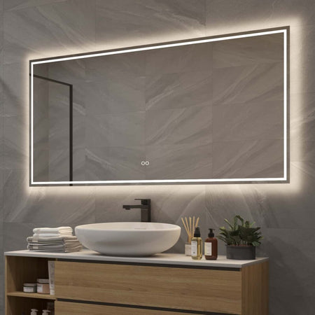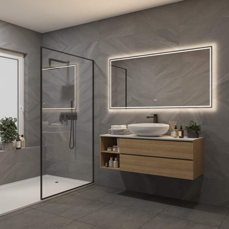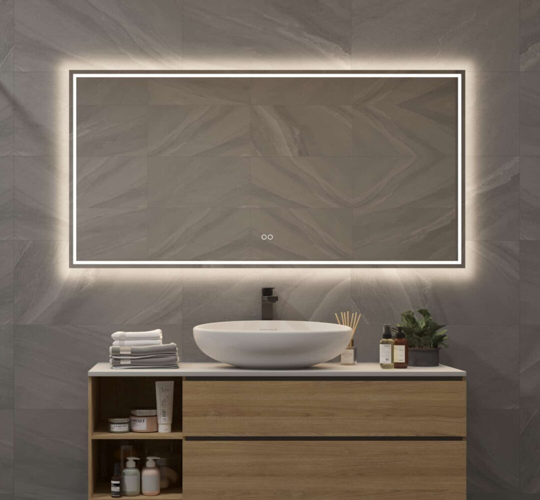 Deze stijlvolle badkamer spiegel is 140 cm breed, 70 cm hoog en slechts 3 cm diep. De spiegel is van alle gemakken voorzien, zoals: rondom directe en indirecte verlichting, spiegelverwarming en een dubbele touch schakelaar waarmee zowel de lichtkleur als lichtsterkte kan worden ingesteld.