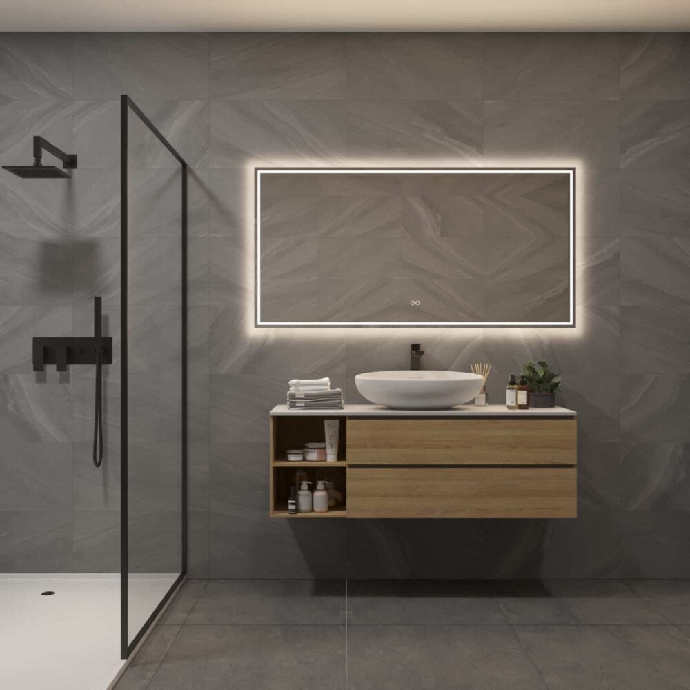 De directe verlichting is rondom de spiegel geplaatst en zorgt hiermee voor een praktisch licht in het gezicht, terwijl de indirecte verlichting vanachter de spiegel sfeervol rondom over de wand schijnt.