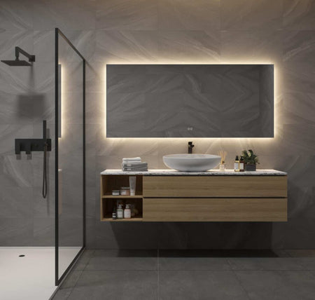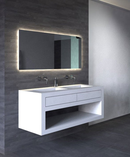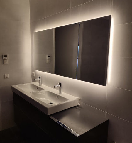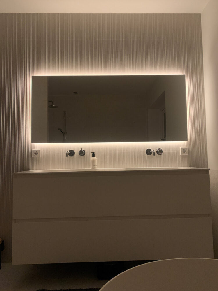 Deze LED spiegel van maar liefst 160 cm breed geeft veel sfeer in de badkamer dankzij de rondom geplaatste indirecte verlichting. De LED verlichting ligt mooi verzonken in het aluminium frame en schijnt vanachter de spiegel over de wand en het badmeubel.