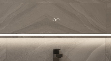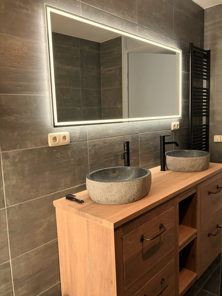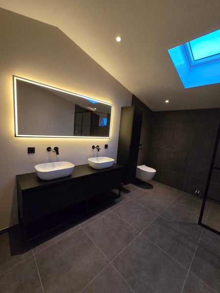 De directe verlichting is rondom de spiegel geplaatst en zorgt hiermee voor een praktisch licht in het gezicht, terwijl de indirecte verlichting vanachter de spiegel sfeervol rondom over de wand schijnt.