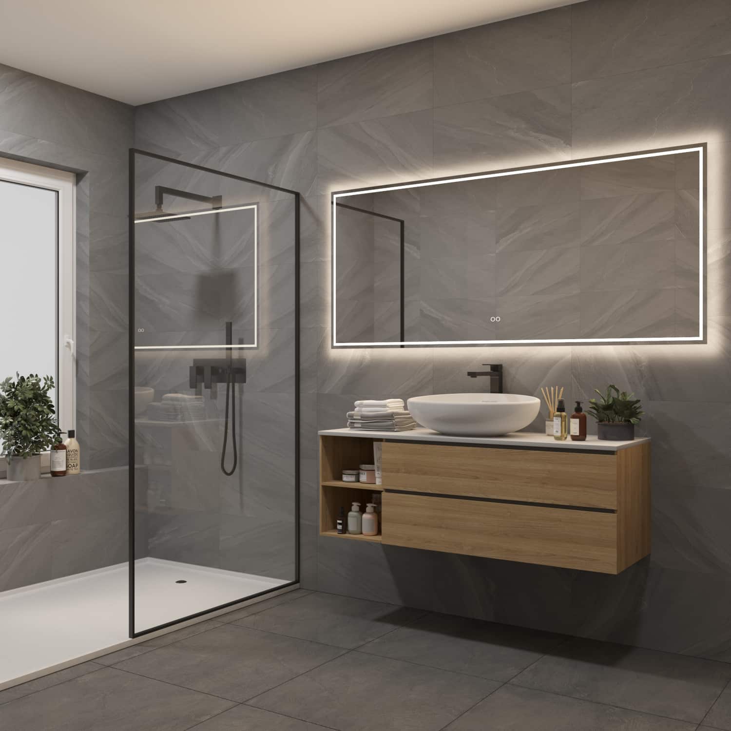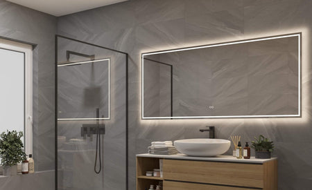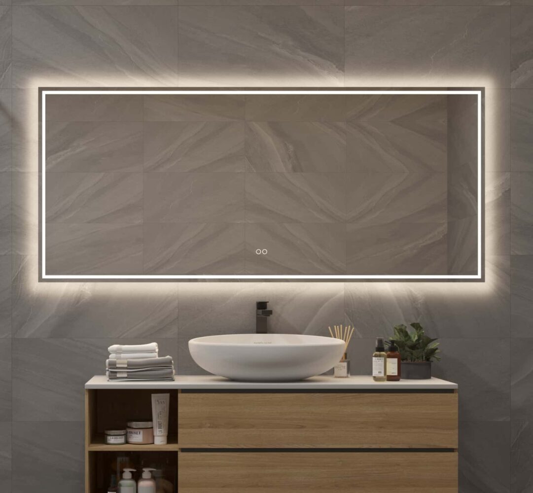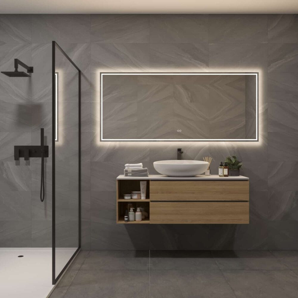 Deze luxe badkamer spiegel is 160 cm breed, 70 cm hoog en slechts 3 cm diep. De spiegel is van alle gemakken voorzien, zoals: rondom directe en indirecte verlichting, spiegelverwarming en een dubbele touch schakelaar waarmee zowel de lichtkleur als lichtsterkte kan worden ingesteld.