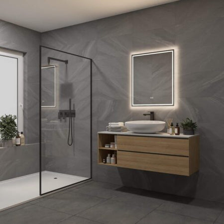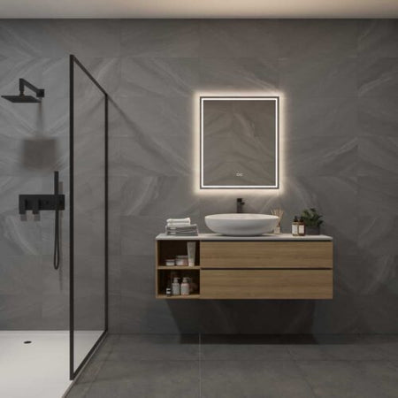 Stijlvolle, moderne LED badkamer spiegel met een hoge lichtopbrengst. Deze spiegel is 60 cm breed, 70 cm hoog en slechts 3 cm diep. Naast geïntegreerde verlichting beschikt de spiegel ook over spiegelverwarming tegen het beslaan van de spiegel en een dubbele touch schakelaar.