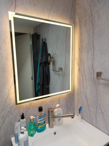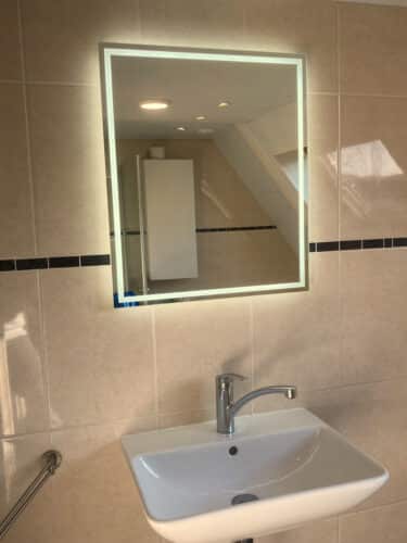 De directe verlichting is rondom de spiegel geplaatst en zorgt hiermee voor een praktisch licht in het gezicht, terwijl de indirecte verlichting sfeervol rondom de spiegel over de wand schijnt.