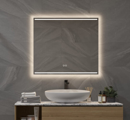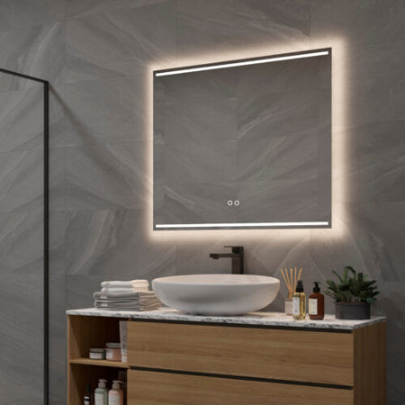 Deze design badkamer spiegel van 80 cm breed en 70 cm hoog is uitgevoerd met verlichting, spiegelverwarming en een dubbele touch schakelaar met oa een handige dimfunctie. De indirecte verlichting schijnt vanachter de spiegel fraai over de wand. De horizontale verlichting aan de boven- en onderzijde van de spiegel zorgt voor een praktisch licht in het gezicht en tevens voor veel omgevingslicht.