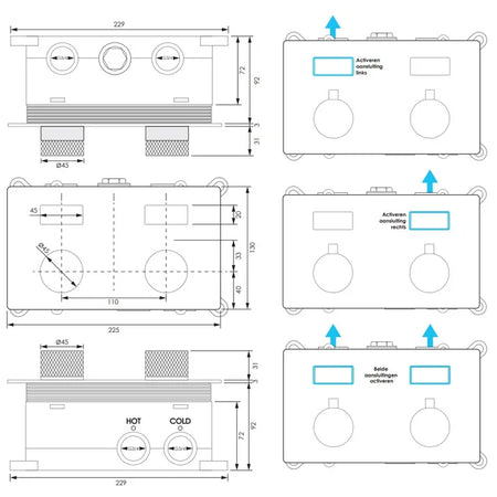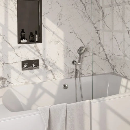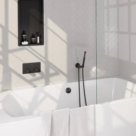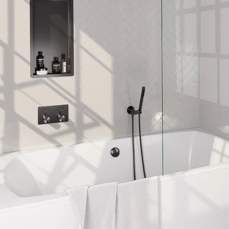 De thermostaatkraan heeft twee druk- en twee draaiknoppen waarmee je de kraan bedient. Met de drukknoppen switch je tussen de handdouche en de badvulcombinatie. Ook kan je ze tegelijk laten stromen door de knopjes tegelijk in te drukken, handig! Om de temperatuur aan te passen, draai je aan de rechter draaiknop. Op 38 graden zit een temperatuurbegrenzer. Door op het knopje te drukken, kan je 'm heter draaien, veilig! Met het draaiknopje links pas je de waterdruk aan. Zo kan je waterstralen dus precies naar jouw wens aanpassen!