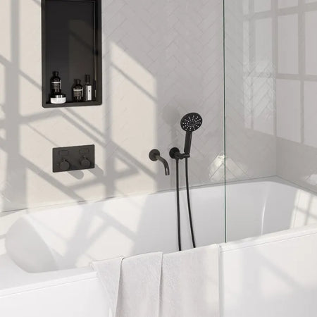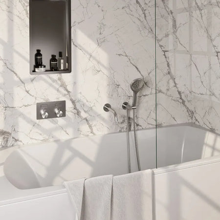 De thermostaatkraan heeft twee druk- en twee draaiknoppen waarmee je de kraan bedient. Met de drukknoppen switch je tussen de handdouche en de uitloop. Ook kan je ze tegelijk laten stromen door de knopjes tegelijk in te drukken, handig! Om de temperatuur aan te passen, draai je aan de rechter draaiknop. Op 38 graden zit een temperatuurbegrenzer. Door op het knopje te drukken, kan je 'm heter draaien, veilig! Met het draaiknopje links pas je de waterdruk aan. Zo kan je waterstralen dus precies naar jouw wens aanpassen!