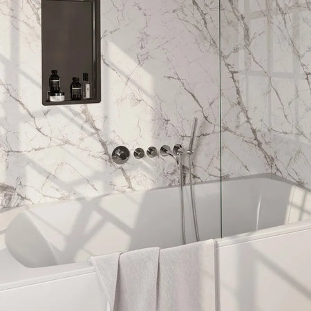 Op zoek naar een echte aanwinst voor jouw bad? Dan is deze inbouw badkraan van Brauer een goede keuze. Deze thermostatische badkraan is compleet met uitloop en staafhanddouche. De inbouwthermostaat bedien je eenvoudig met de knoppen. Is het opvallende reliëf op de knoppen jouw al opgevallen?! Dat is kenmerkend voor de Carving collectie. Met de grote knop regel je de temperatuur en met de kleine knoppen zet je de uitloop en handdouche aan of uit. Op 38 graden zit een beveiliging, extra veilig voor de kids!