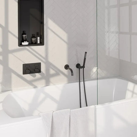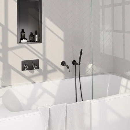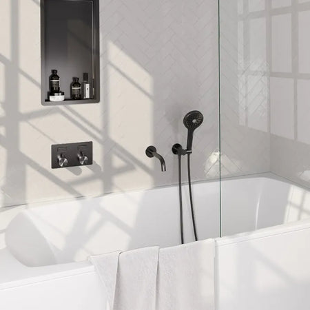 De thermostaatkraan heeft twee druk- en twee draaiknoppen waarmee je de kraan bedient. Met de drukknoppen switch je tussen de handdouche en de uitloop. Ook kan je ze tegelijk laten stromen door de knopjes tegelijk in te drukken, handig! Om de temperatuur aan te passen, draai je aan de rechter draaiknop. Op 38 graden zit een temperatuurbegrenzer. Door op het knopje te drukken, kan je 'm heter draaien, veilig! Met het draaiknopje links pas je de waterdruk aan. Zo kan je waterstralen dus precies naar jouw wens aanpassen!