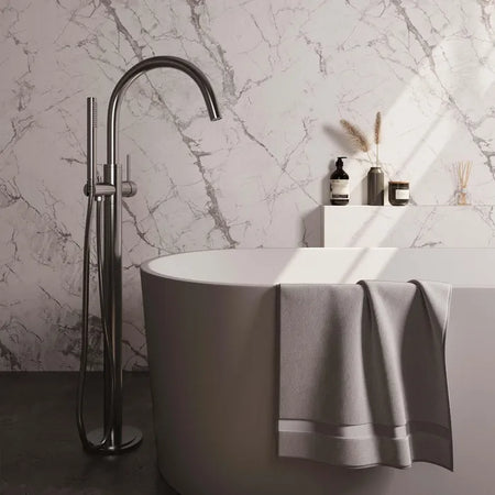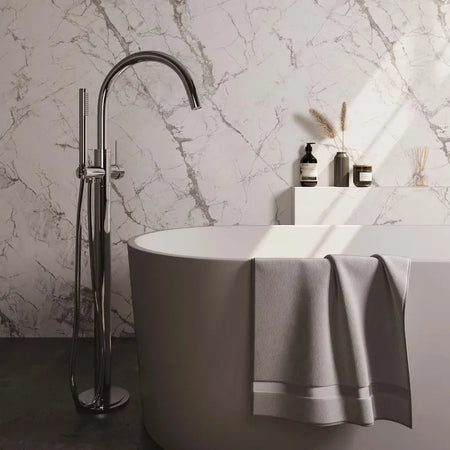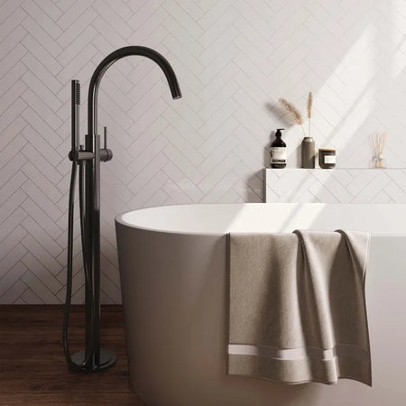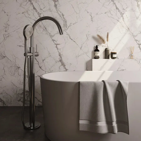 Maak jouw vrijstaande bad helemaal af met deze gave vrijstaande badkraan. Deze badkraan bestaat uit een zwenkbare uitloop, doucheslang en staafhanddouche. Je bedient de kraan eenvoudig via de hendel aan de zijkant. Met de omstelrichting schakel je eenvoudig tussen de handdouche en uitloop. Een echte aanwinst voor je badkamer dus!