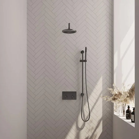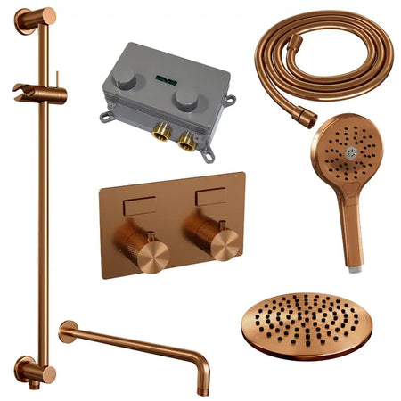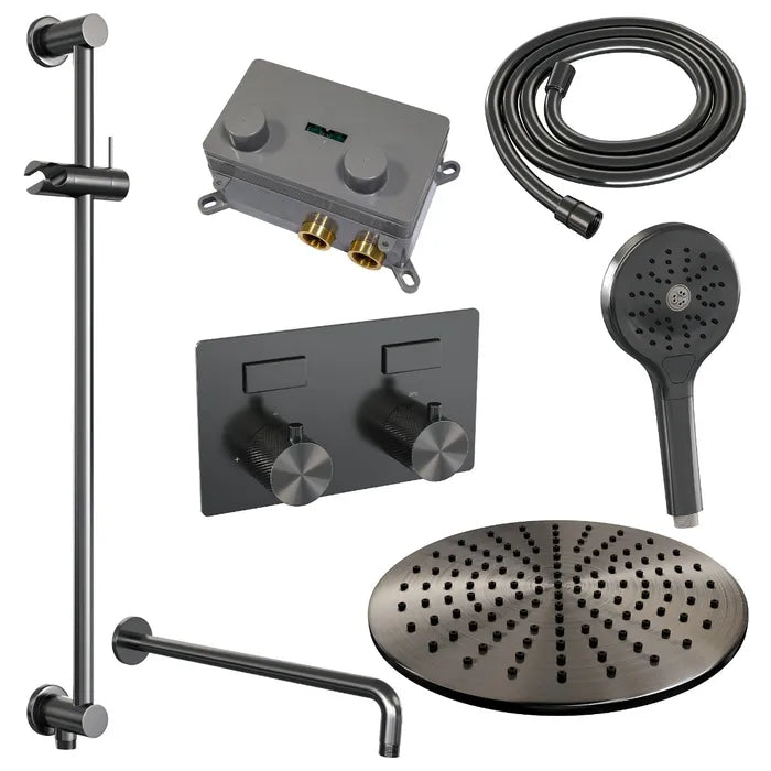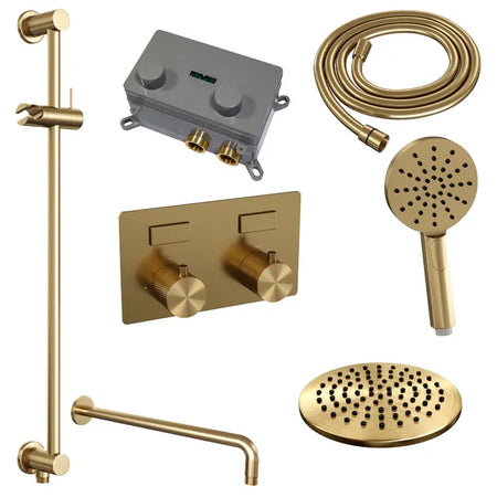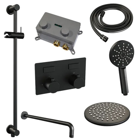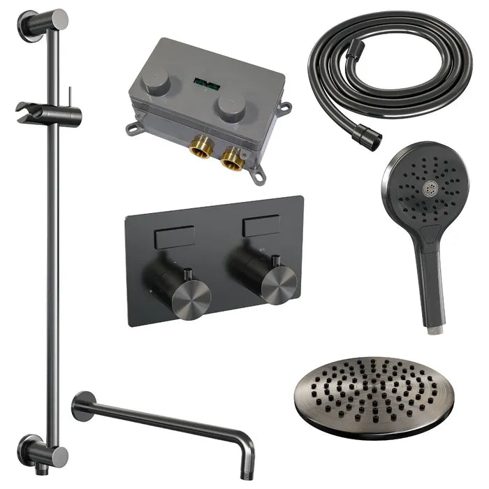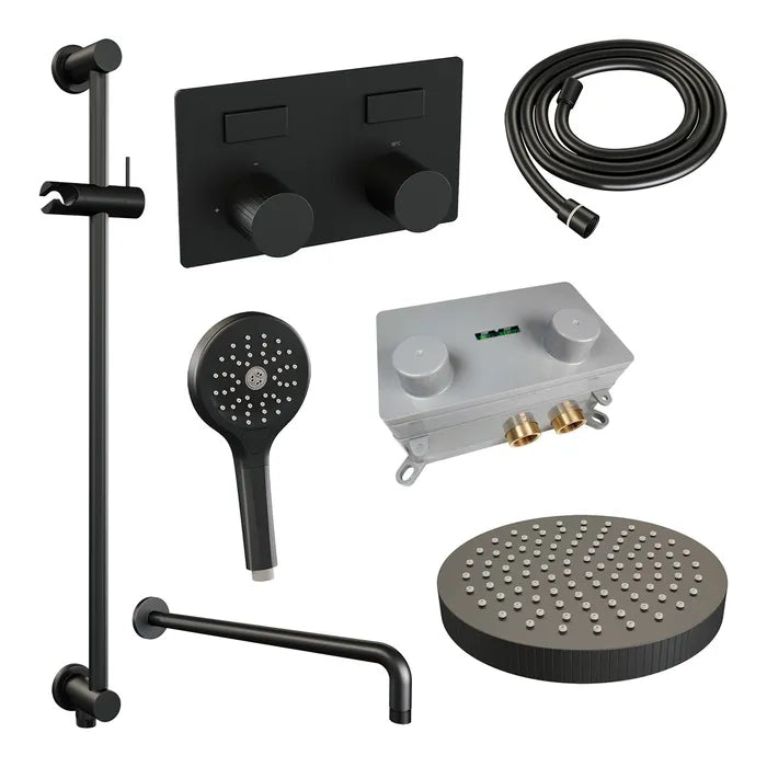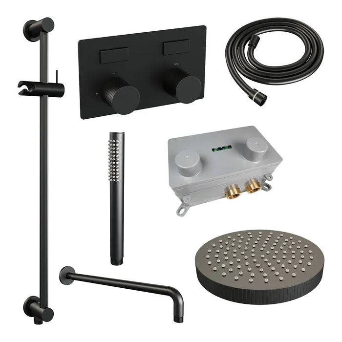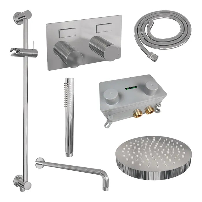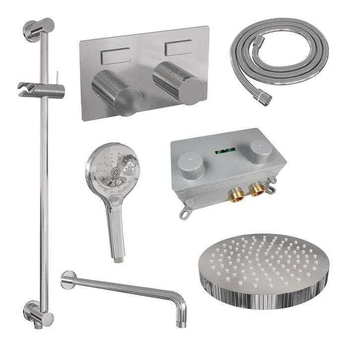 De regendouche wordt geleverd met een inbouw thermostaatkraan met twee druk- en draaiknoppen. Met de drukknopjes switch je eenvoudig tussen de hoofd- en handdouche. Liever tegelijk? Geen punt! Door op allebei de knoppen te drukken, gaan hoofd- en handdouche allebei stromen. De draaiknop aan de rechterkant regelt de temperatuur. Fijn aan deze knop is dat 'ie op 38 graden een temperatuurbegrenzer heeft. Door het knopje in te drukken, haal je de beveiliging er vanaf en kan je 'm heter dan 38 graden draaien. Wat 'm helemaal een musthave maakt, is de draaiknop links. Met deze draaiknop kan je namelijk de waterdruk aanpassen, luxe!
