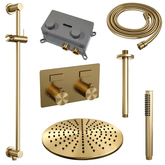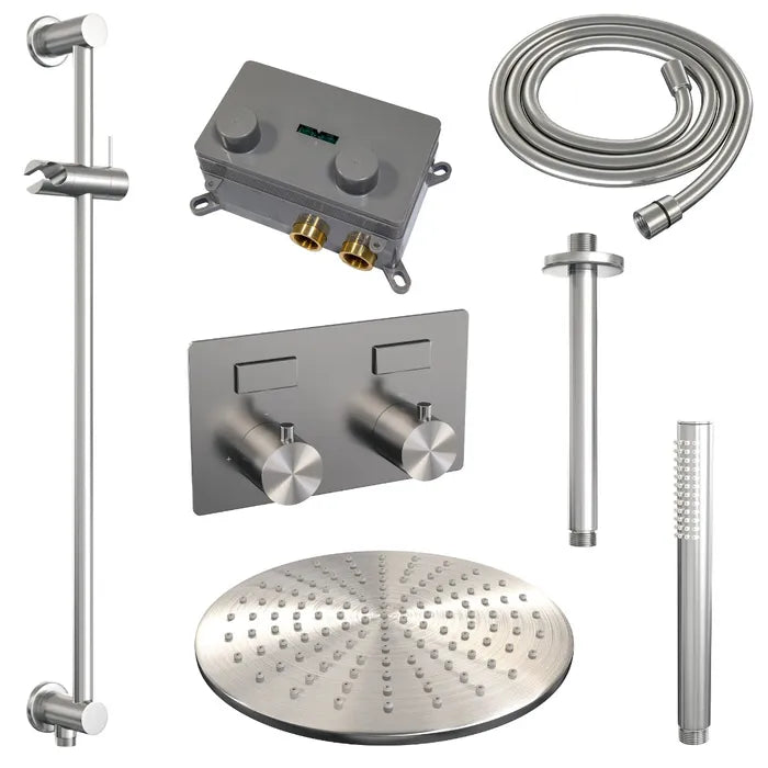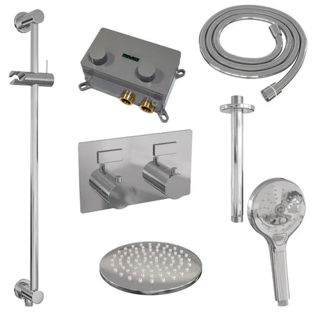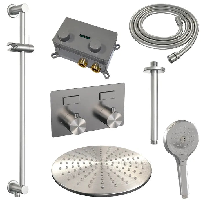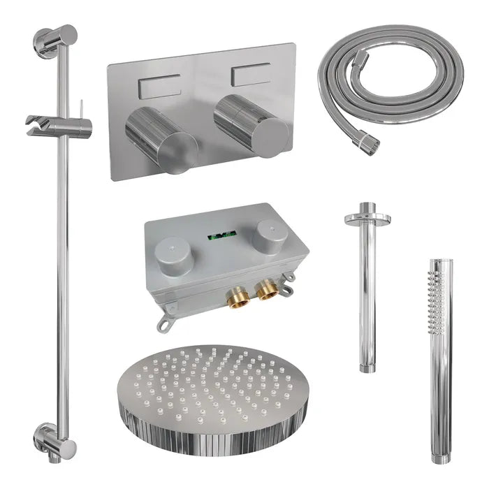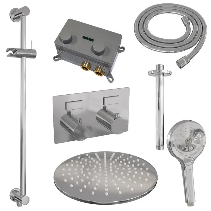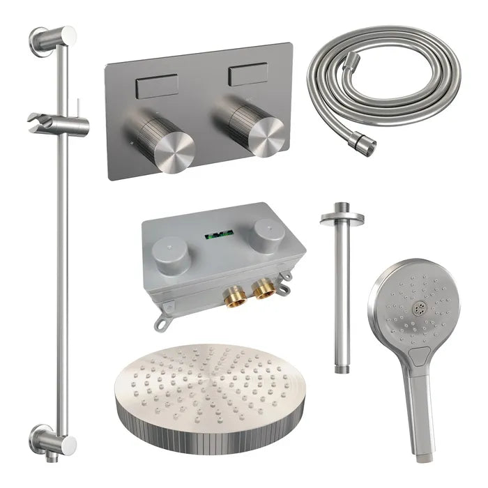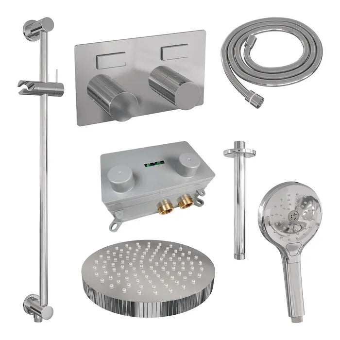 De regendouche wordt geleverd met een inbouw thermostaatkraan met twee druk- en draaiknoppen. Met de drukknopjes switch je eenvoudig tussen de hoofd- en handdouche. Liever tegelijk? Geen punt! Door op allebei de knoppen te drukken, gaan hoofd- en handdouche allebei stromen. De draaiknop aan de rechterkant regelt de temperatuur. Fijn aan deze knop is dat 'ie op 38 graden een temperatuurbegrenzer heeft. Door het knopje in te drukken, haal je de beveiliging er vanaf en kan je 'm heter dan 38 graden draaien. Wat 'm helemaal een musthave maakt, is de draaiknop links. Met deze draaiknop kan je namelijk de waterdruk aanpassen, luxe!