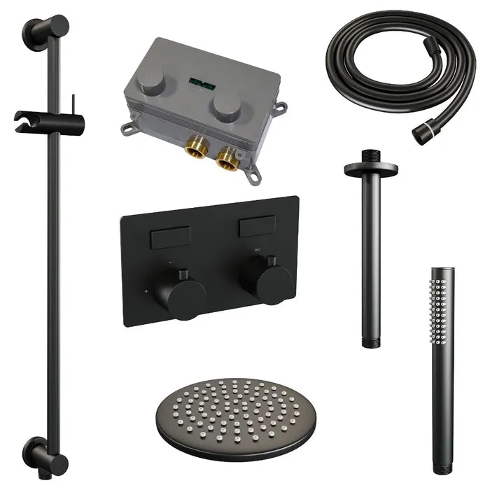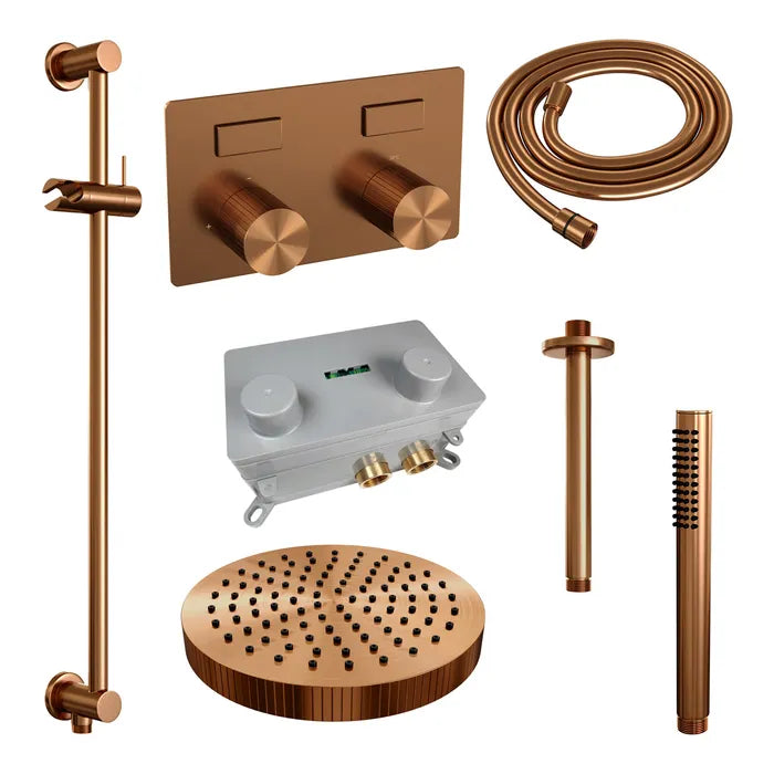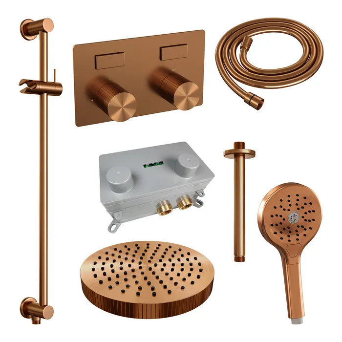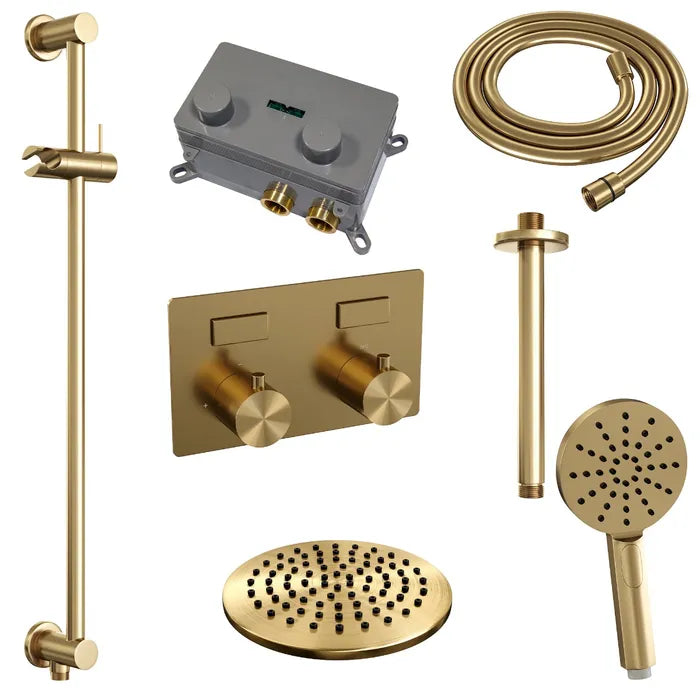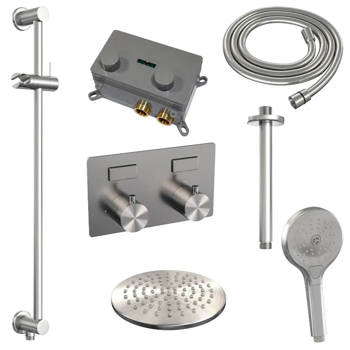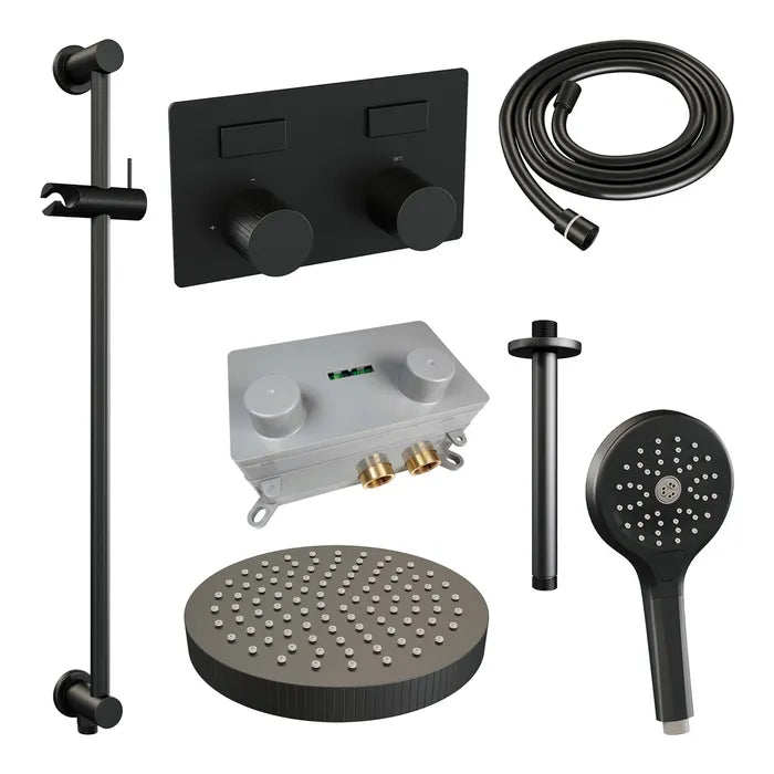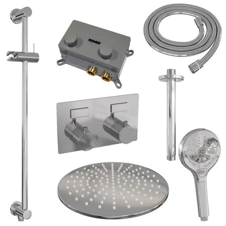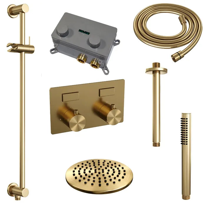 De regendouche wordt geleverd met een inbouw thermostaatkraan met twee druk- en draaiknoppen. Met de drukknopjes switch je eenvoudig tussen de hoofd- en handdouche. Liever tegelijk? Geen punt! Door op allebei de knoppen te drukken, gaan hoofd- en handdouche allebei stromen. De draaiknop aan de rechterkant regelt de temperatuur. Fijn aan deze knop is dat 'ie op 38 graden een temperatuurbegrenzer heeft. Door het knopje in te drukken, haal je de beveiliging er vanaf en kan je 'm heter dan 38 graden draaien. Wat 'm helemaal een musthave maakt, is de draaiknop links. Met deze draaiknop kan je namelijk de waterdruk aanpassen, luxe!