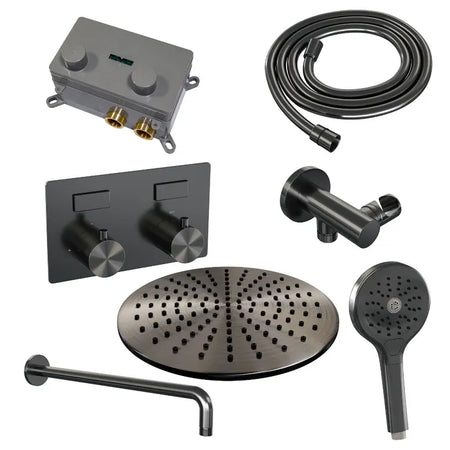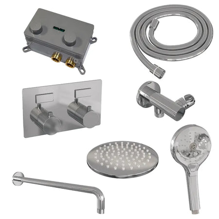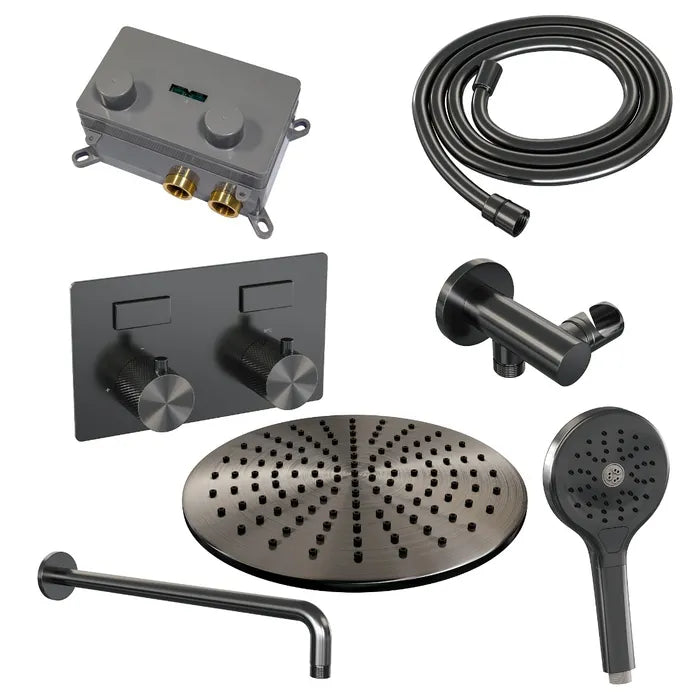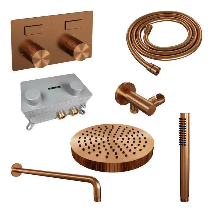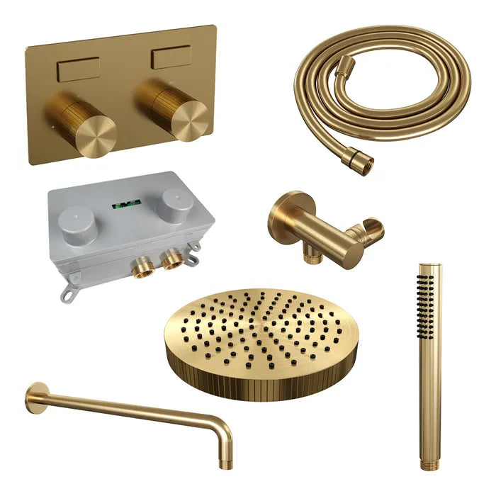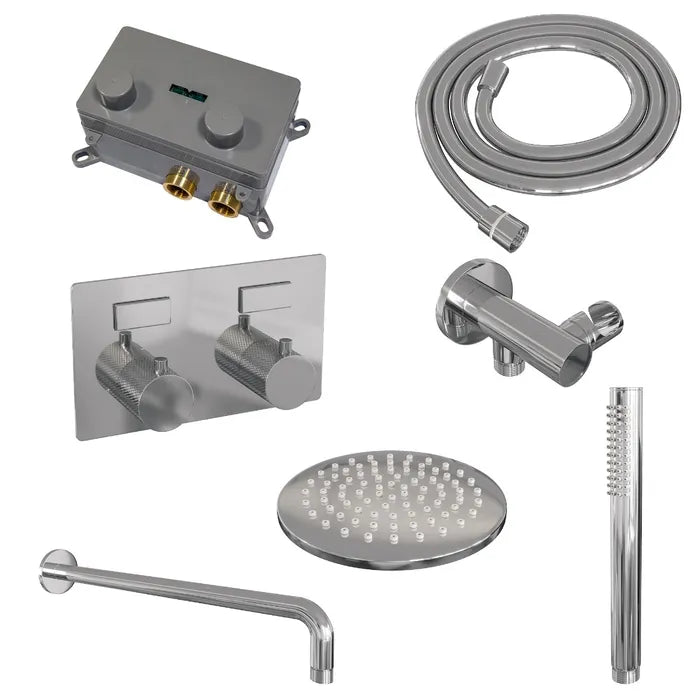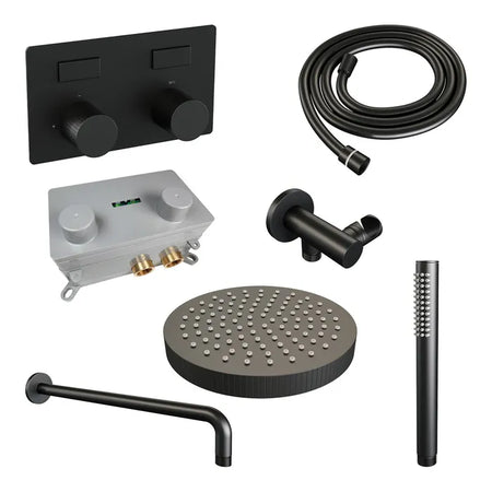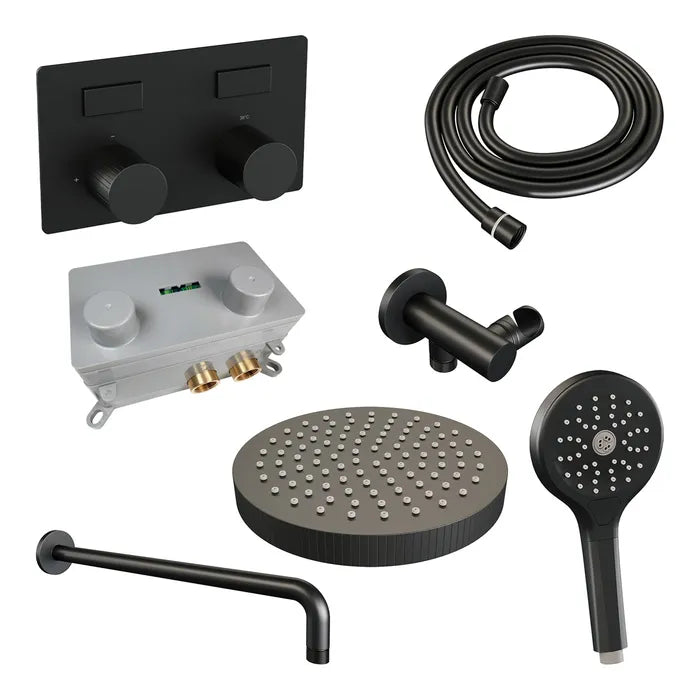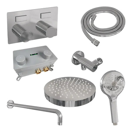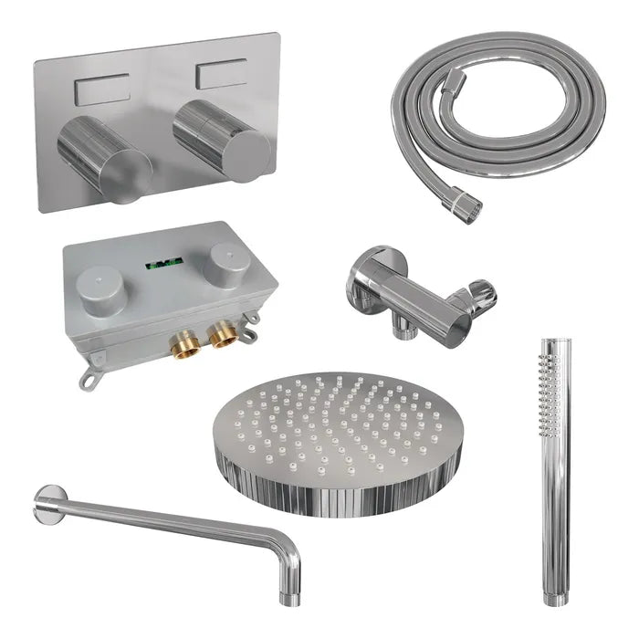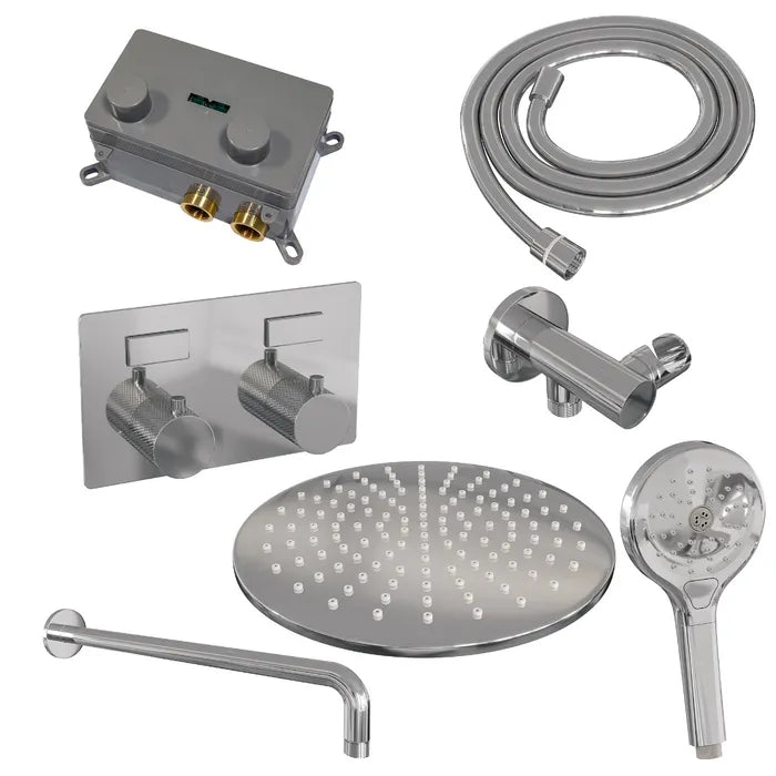 De regendouche wordt geleverd met een inbouw thermostaatkraan met twee druk- en draaiknoppen. Met de drukknopjes switch je eenvoudig tussen de hoofd- en handdouche. Liever tegelijk? Geen punt! Door op allebei de knoppen te drukken, gaan hoofd- en handdouche allebei stromen. De draaiknop aan de rechterkant regelt de temperatuur. Fijn aan deze knop is dat 'ie op 38 graden een temperatuurbegrenzer heeft. Door het knopje in te drukken, haal je de beveiliging er vanaf en kan je 'm heter dan 38 graden draaien. Wat 'm helemaal een musthave maakt, is de draaiknop links. Met deze draaiknop kan je namelijk de waterdruk aanpassen, luxe!