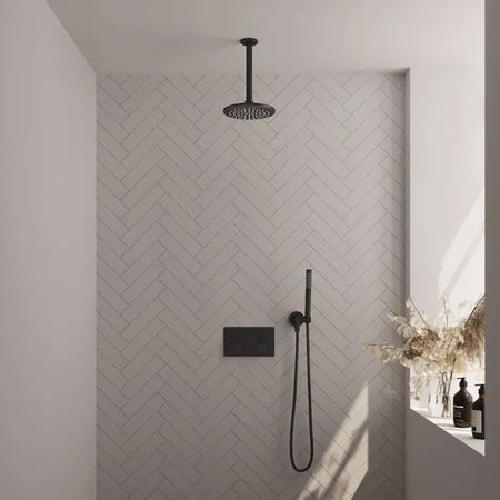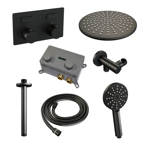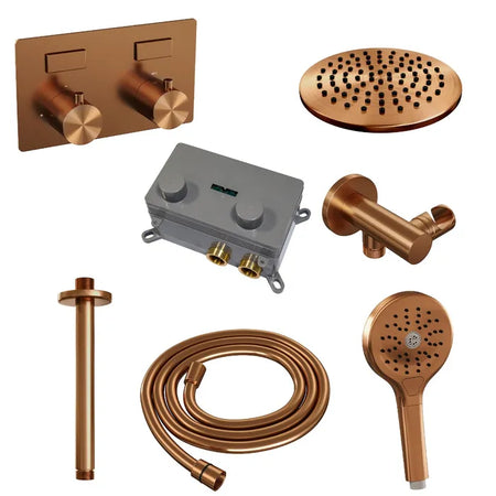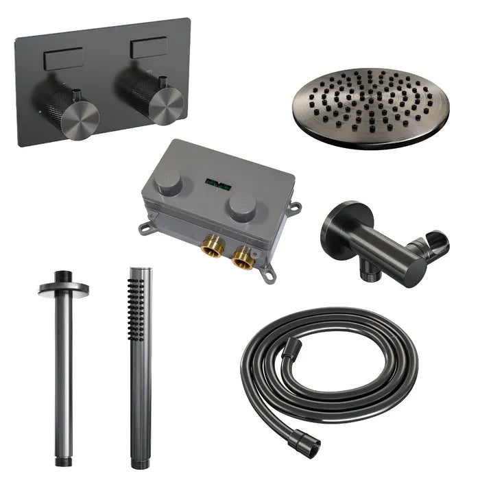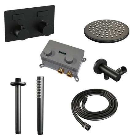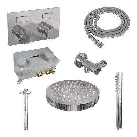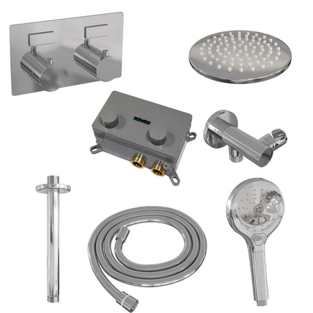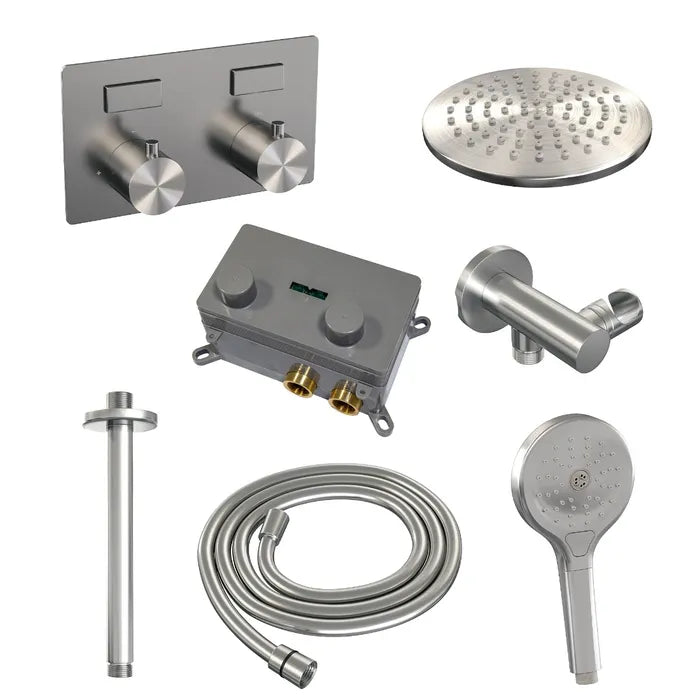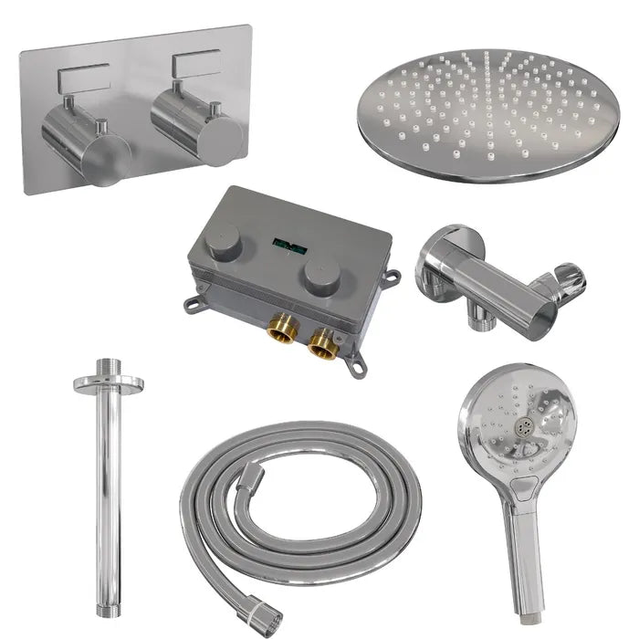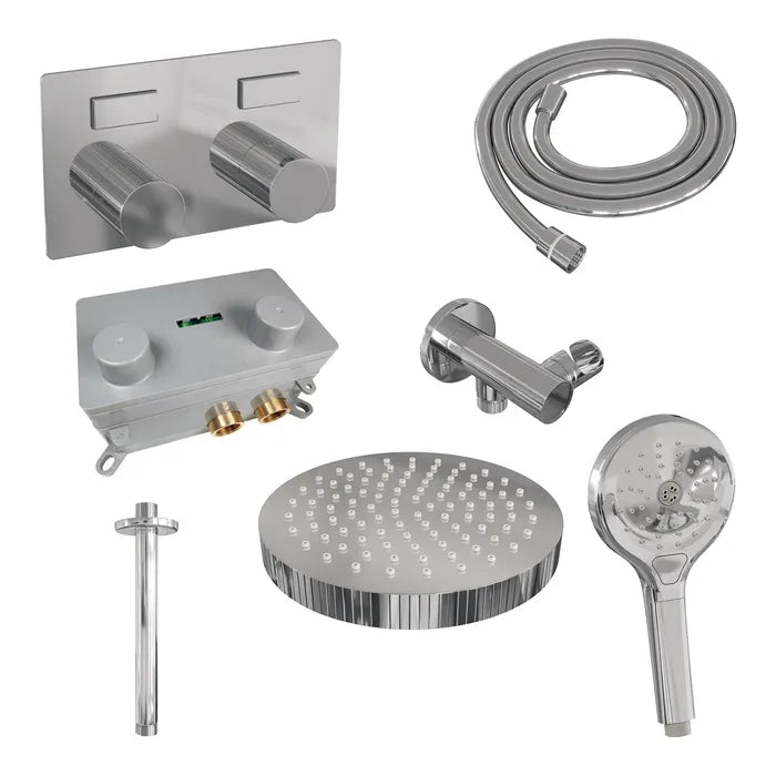 De regendouche wordt geleverd met een inbouw thermostaatkraan met twee druk- en draaiknoppen. Met de drukknopjes switch je eenvoudig tussen de hoofd- en handdouche. Liever tegelijk? Geen punt! Door op allebei de knoppen te drukken, gaan hoofd- en handdouche allebei stromen. De draaiknop aan de rechterkant regelt de temperatuur. Fijn aan deze knop is dat 'ie op 38 graden een temperatuurbegrenzer heeft. Door het knopje in te drukken, haal je de beveiliging er vanaf en kan je 'm heter dan 38 graden draaien. Wat 'm helemaal een musthave maakt, is de draaiknop links. Met deze draaiknop kan je namelijk de waterdruk aanpassen, luxe!