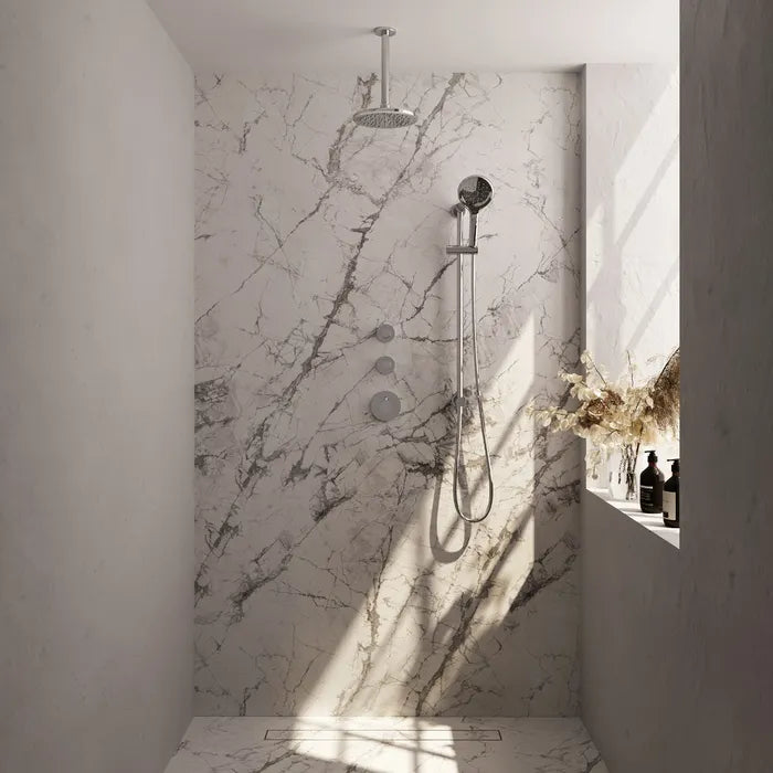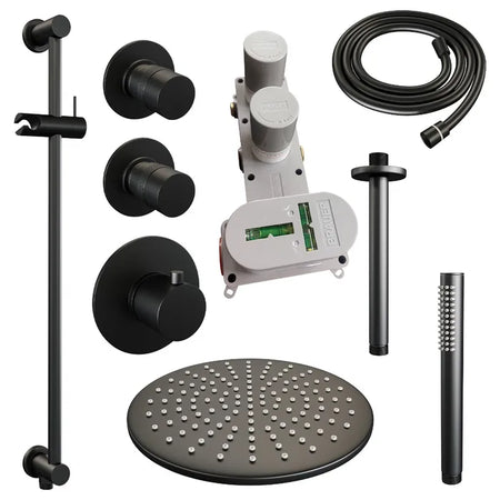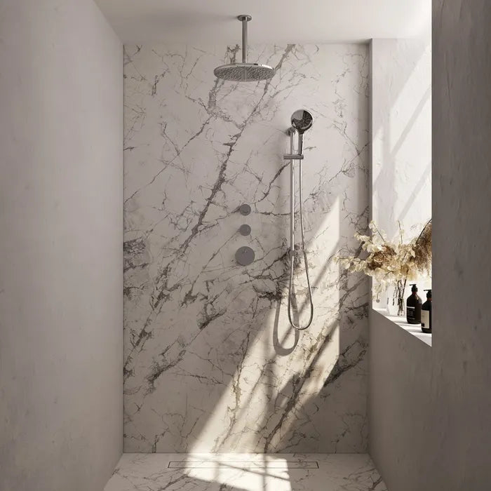 Deze inbouw regendouche is een complete inbouwdouche set waarmee je je badkamer laat schitteren. De douche straalt luxe uit en is zeer comfortabel. Met de inbouwthermostaat bepaal je je gewenste temperatuur. Ook zit er temperatuurbegrenzing op waardoor het water eerst niet warmer wordt dan 38 graden, maar pas wanneer de beveiliging eraf wordt gehaald. Extra veilig voor de kids! Met de stopkranen switch je tussen de hoofd- en en handdouche.