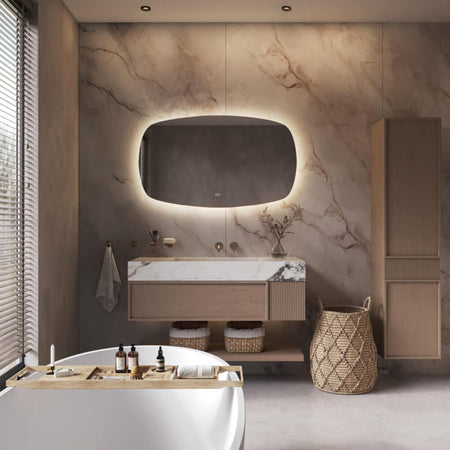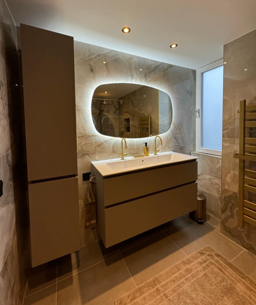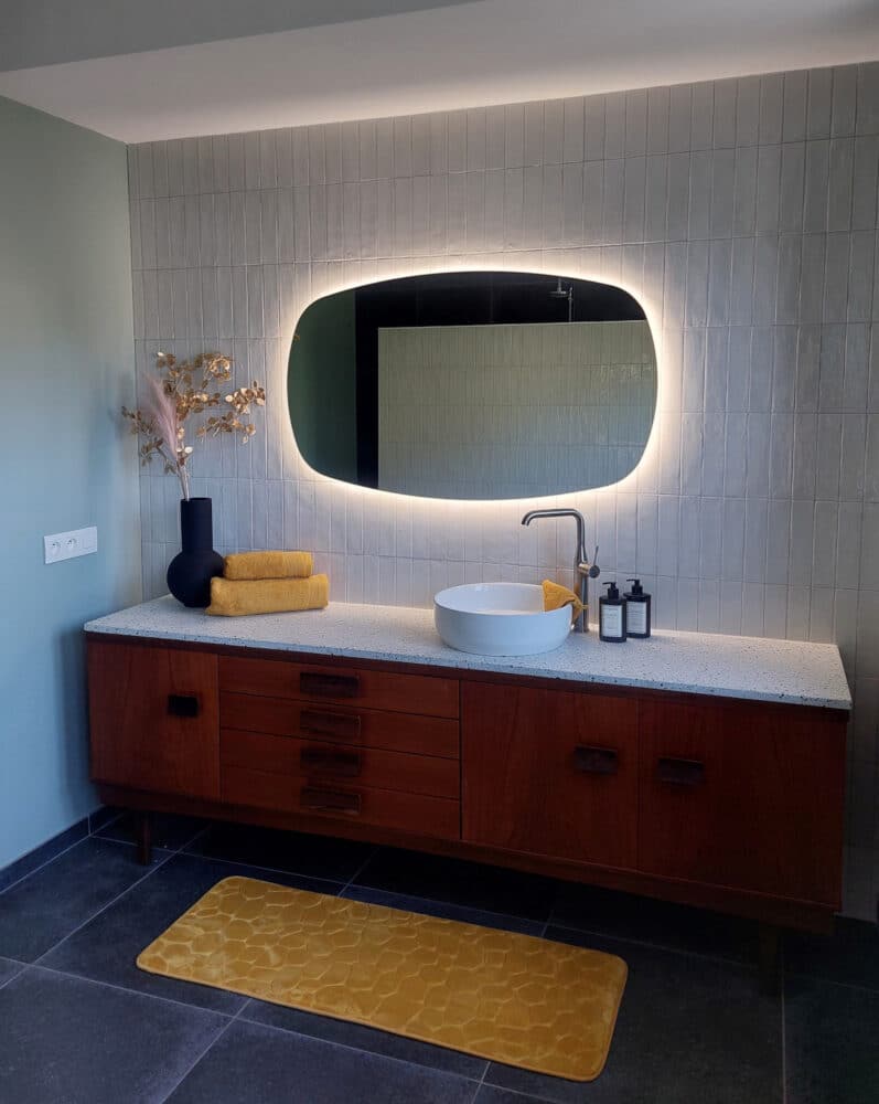 Deze trendy, Deens ovale badkamer spiegel heeft een afmeting van 120×70 cm en is van alle gemakken voorzien, zoals verlichting, spiegelverwarming en een praktische, dubbele touch schakelaar om de verlichting mee te dimmen en de gewenste lichtkleur mee in te stellen, handig!