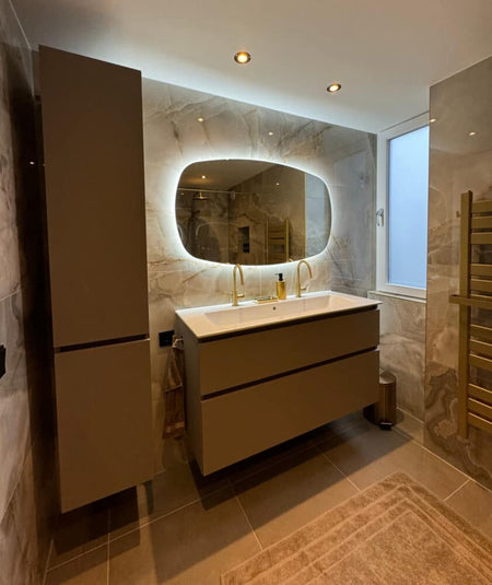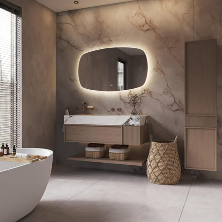 De verlichting schijnt vanachter de spiegel fraai en sfeervol over de wand. De geïntegreerde spiegelverwarming voorkomt dat de spiegel beslaat na bv het douchen. De spiegel wordt volledig aansluitklaar geleverd inclusief de benodigde bevestigingsmaterialen.