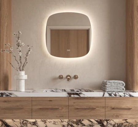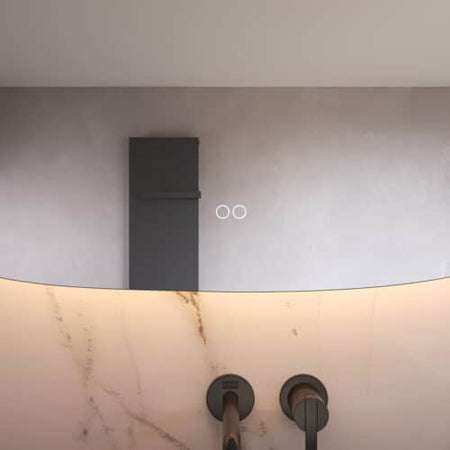 Deze trendy, Deens ovale badkamer spiegel heeft een afmeting van 60×60 cm en is van alle gemakken voorzien, zoals verlichting, spiegelverwarming en een praktische, dubbele touch schakelaar om de verlichting mee te dimmen en de gewenste lichtkleur mee in te stellen, handig!