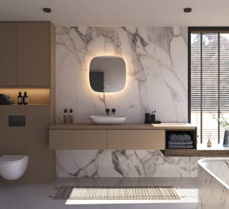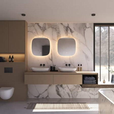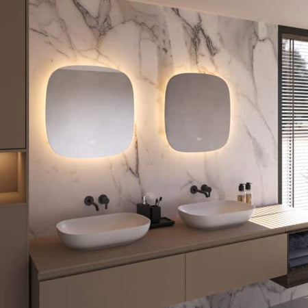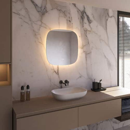 De verlichting schijnt vanachter de spiegel fraai en sfeervol over de wand. De geïntegreerde spiegelverwarming voorkomt dat de spiegel beslaat na bv het douchen. De spiegel wordt volledig aansluitklaar geleverd inclusief de benodigde bevestigingsmaterialen.