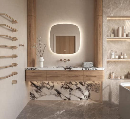 Deze trendy, Deens ovale badkamer spiegel heeft een afmeting van 80×80 cm en is van alle gemakken voorzien, zoals verlichting, spiegelverwarming en een praktische, dubbele touch schakelaar om de verlichting mee te dimmen en de gewenste lichtkleur mee in te stellen, handig!