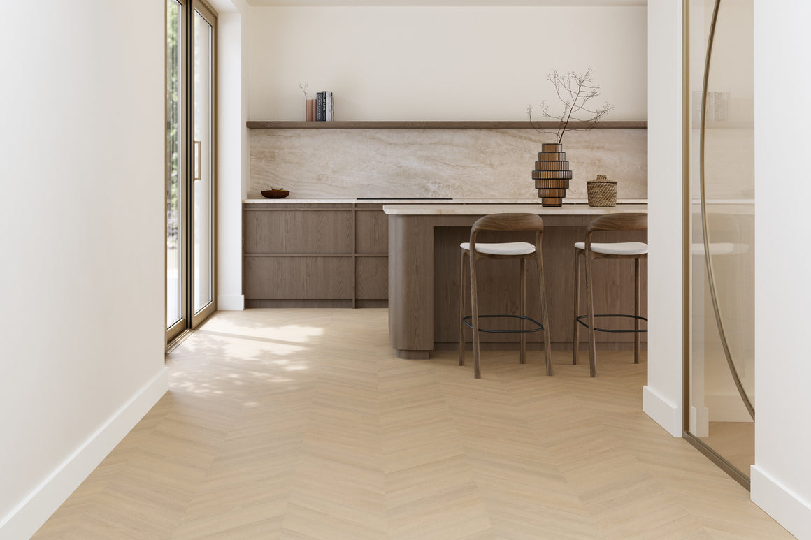De Futuro Hongaarse punt wordt gelegd in een hoek van 120 graden. Dit legpatroon staat bekend om zijn subtiele en verfijnde uitstraling, waarmee je een ruimte een elegante en luxueuze sfeer kunt geven.