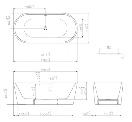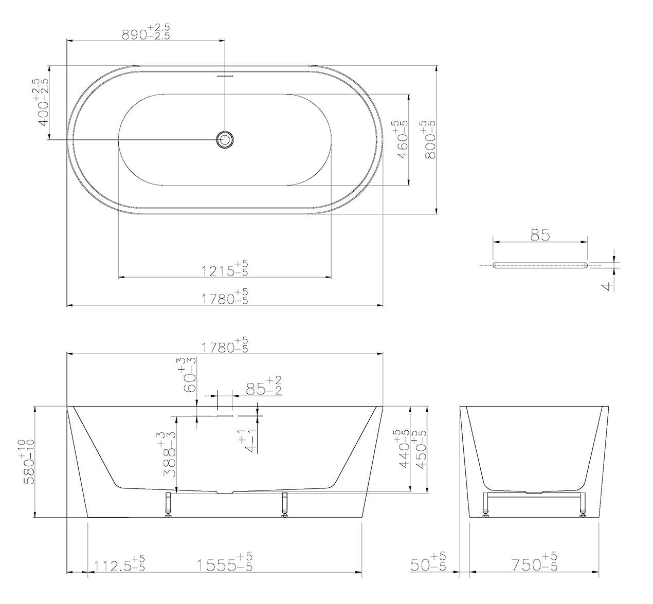 Libero vrijstaand ligbad 178 x 80 cm acryl glans wit - met waste wit glans