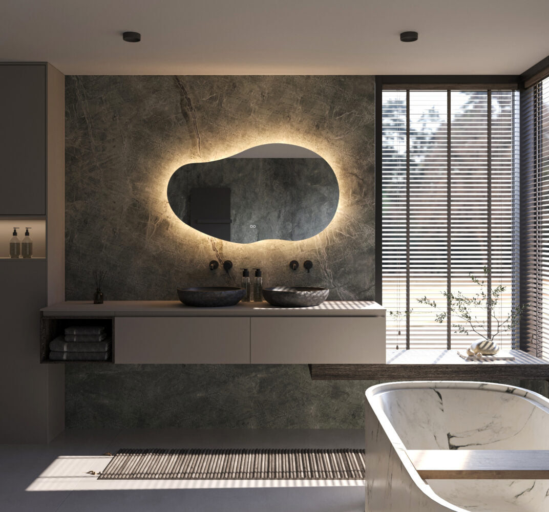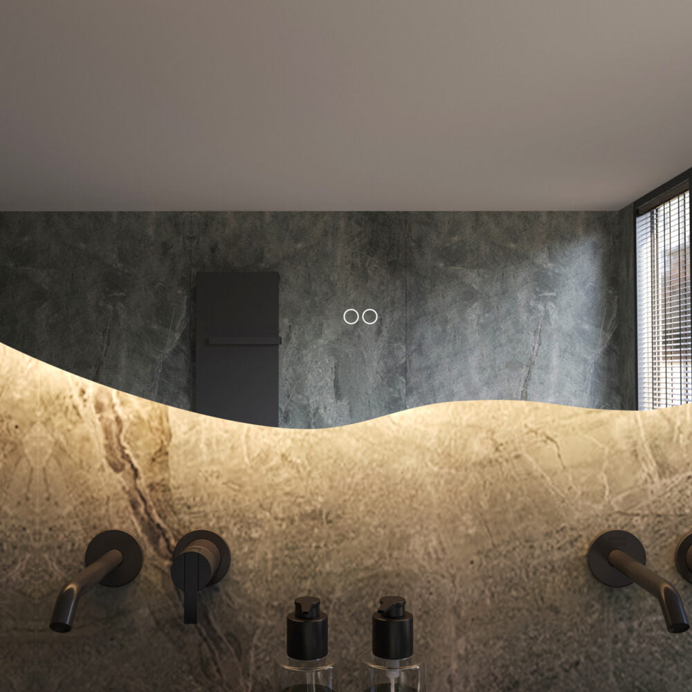 Deze 120 cm brede organische spiegel met indirecte verlichting is de nieuwste trend voor de badkamer! De organische vormgeving en de indirecte verlichting zorgen voor een warme en uitnodigende sfeer in de badkamer. Door de traploze instelling van de lichtkleur tussen 2700K en 6400K pas je de verlichting naar wens aan. Zo kies je bijvoorbeeld voor helder wit licht tijdens je ochtendroutine en warmer licht voor een ontspannen bad in de avond.