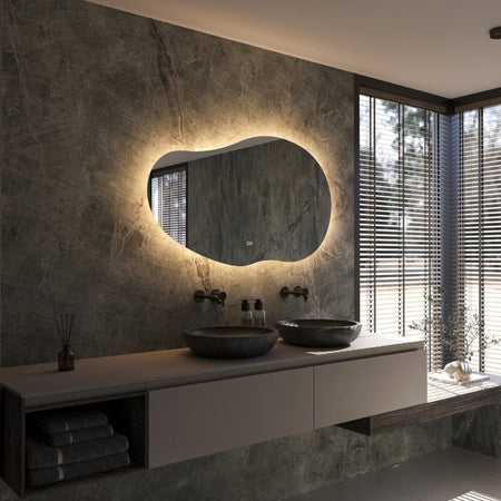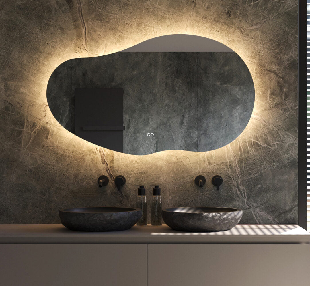 Deze organische badkamer spiegel met indirecte verlichting en spiegelverwarming is de perfecte toevoeging aan jouw badkamer. Door de combinatie van de organische vormgeving, de traploze instelling van de lichtkleur en de spiegelverwarming, ben je verzekerd van een luxe en praktische ervaring. Haal deze trendsettende spiegel in huis en geniet van je eigen persoonlijke spa-ervaring in jouw eigen badkamer.