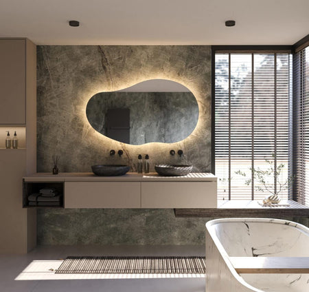 Deze organische badkamer spiegel met indirecte verlichting en spiegelverwarming is de perfecte toevoeging aan jouw badkamer. Door de combinatie van de organische vormgeving, de traploze instelling van de lichtkleur en de spiegelverwarming, ben je verzekerd van een luxe en praktische ervaring. Haal deze trendsettende spiegel in huis en geniet van je eigen persoonlijke spa-ervaring in jouw eigen badkamer.