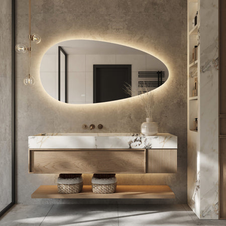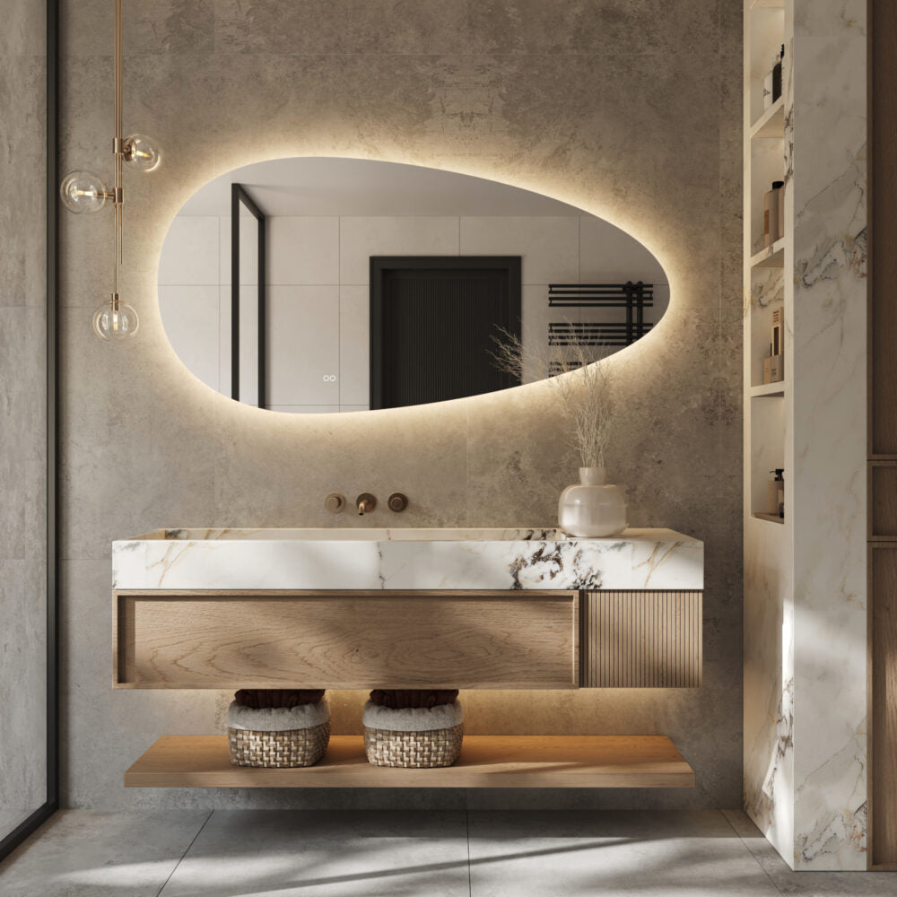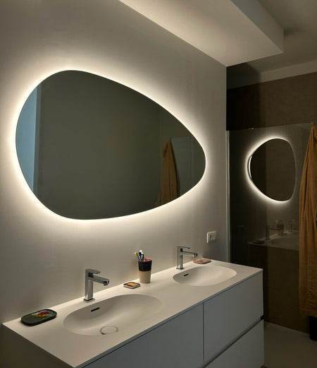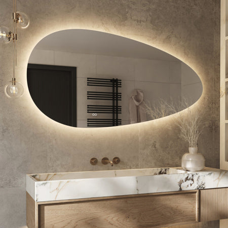 Deze organische badkamer spiegel met indirecte verlichting en spiegelverwarming is de perfecte toevoeging aan jouw badkamer. Door de combinatie van de organische vormgeving, de traploze instelling van de lichtkleur en de spiegelverwarming, ben je verzekerd van een luxe en praktische ervaring. Haal deze trendsettende spiegel in huis en geniet van je eigen persoonlijke spa-ervaring in jouw eigen badkamer.