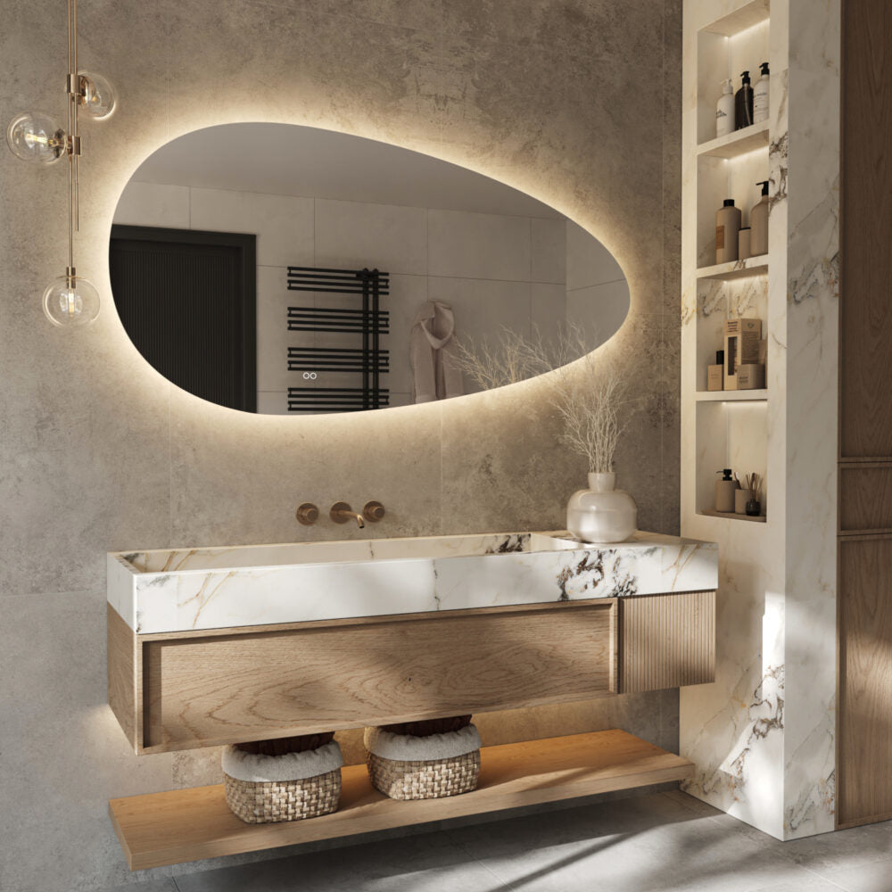 Deze organische spiegel met indirecte verlichting van 160 cm breed en 80 cm hoog is de nieuwste trend voor de badkamer! De organische vormgeving en de indirecte verlichting zorgen voor een warme en uitnodigende sfeer in de badkamer. Door de traploze instelling van de lichtkleur tussen 2700K en 6400K pas je de verlichting naar wens aan. Zo kies je bijvoorbeeld voor helder wit licht tijdens je ochtendroutine en warmer licht voor een ontspannen bad in de avond.