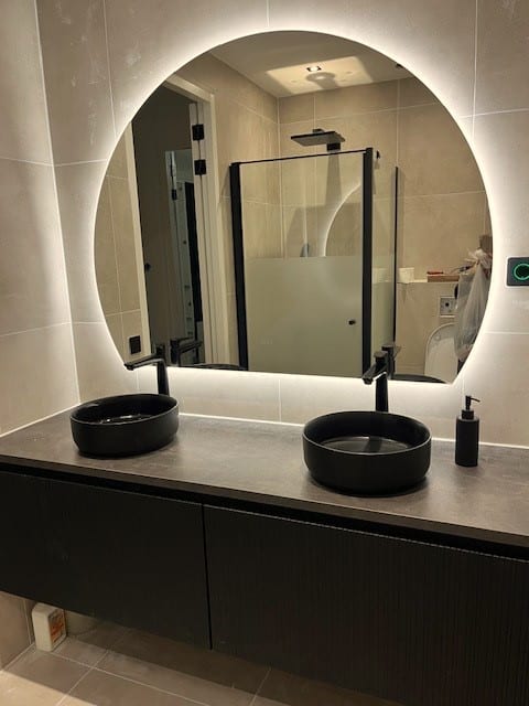 De geïntegreerde spiegelverwarming zorgt ervoor dat de spiegel niet beslaat na bv het douchen.