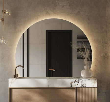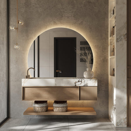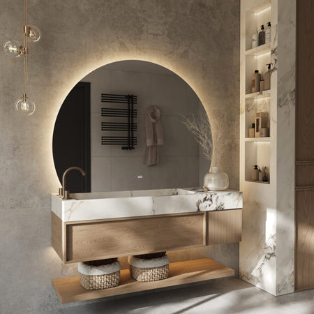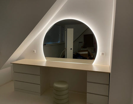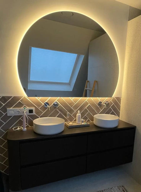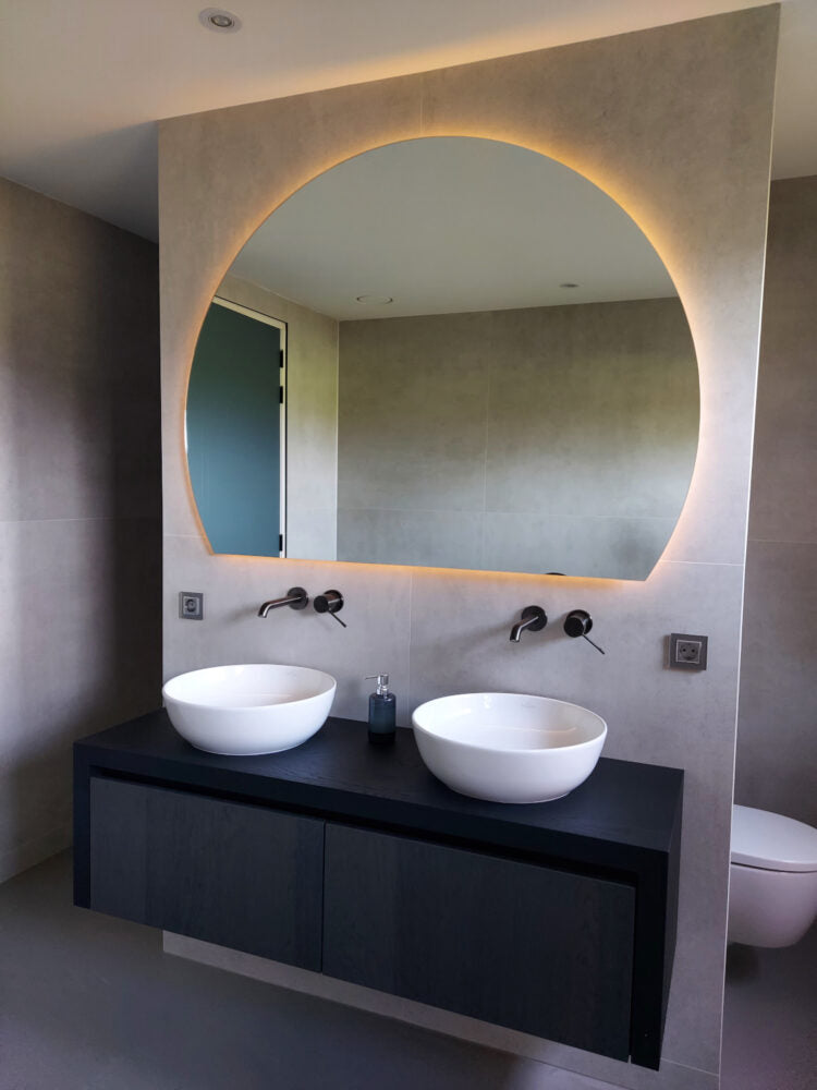 De indirecte verlichting schijnt vanachter de spiegel fraai en sfeervol rondom over de wand. Hierdoor is de verlichting praktisch in gebruik en zorgt het daarnaast voor veel sfeer in de badkamer.