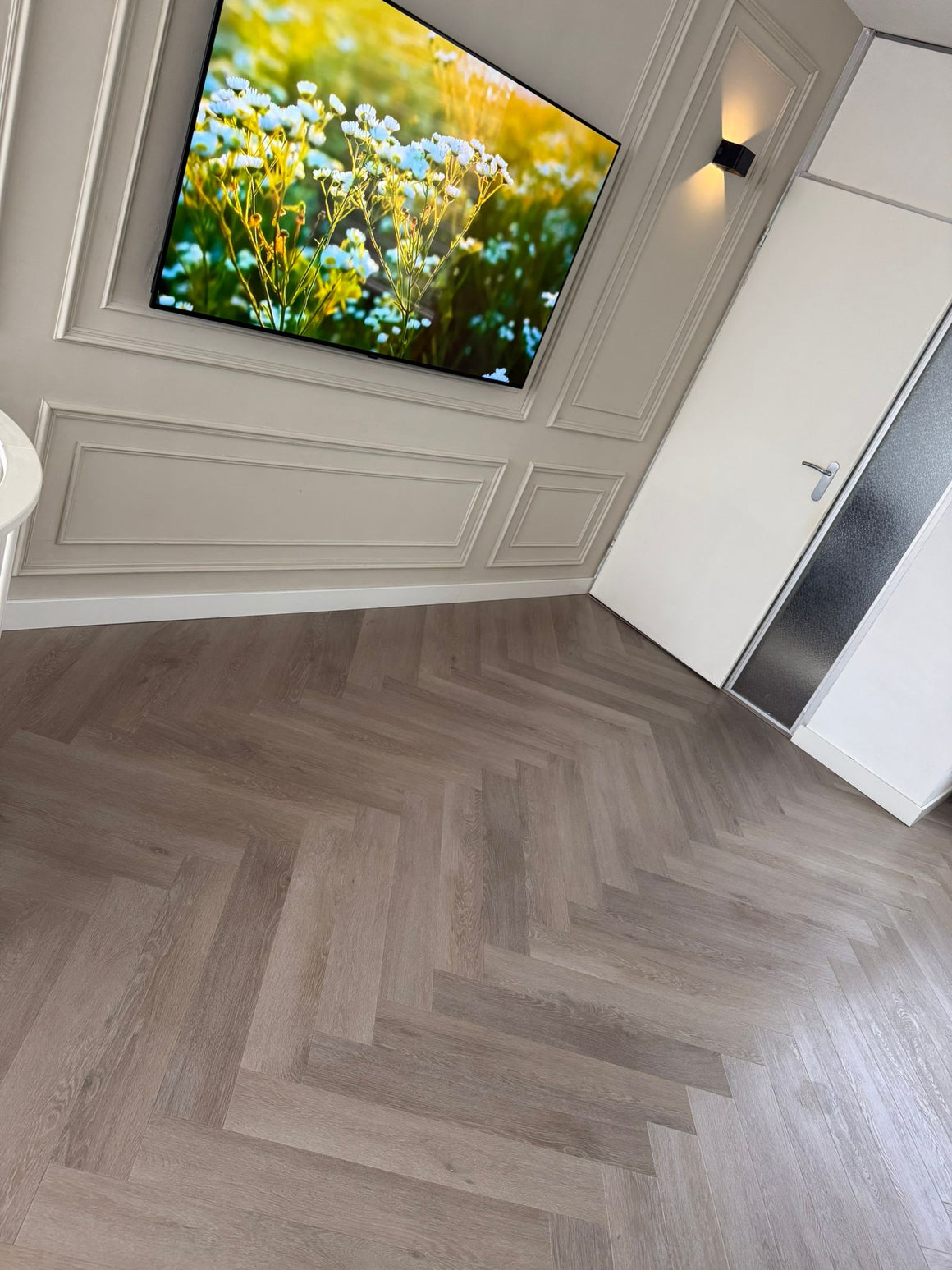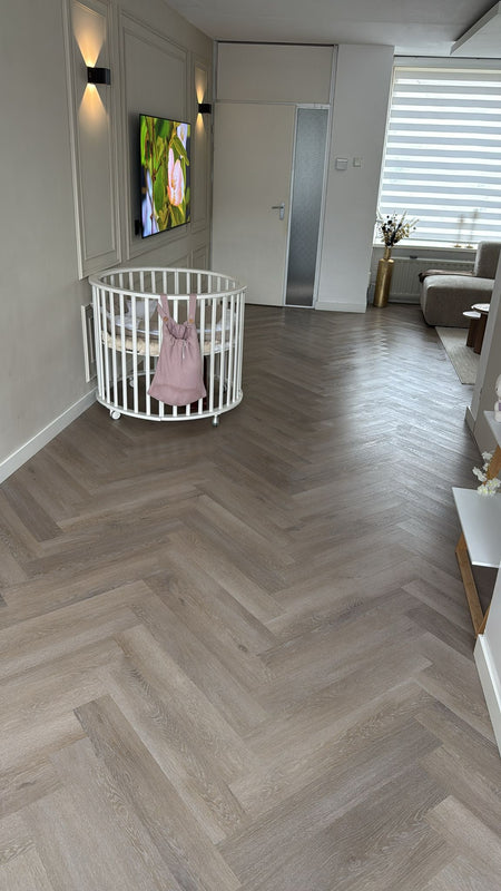De Ava Herringbone SPC Rigid, met zijn verfijnde lichtbruin-grijze tint, voegt een vleugje elegantie en luxe toe aan elke ruimte. Deze vloer combineert moeiteloos warmte en koelte, is geluiddempend, geschikt voor vloerverwarming en -koeling, 100% waterbestendig, voelt warm aan, is hygiënisch en eenvoudig te onderhouden, en biedt bovendien slijtvastheid en een natuurgetrouwe uitstraling voor jarenlang plezier. De SPC rigid vloeren van Otium at Home zijn voorzien van een geïntegreerde ondervloer.