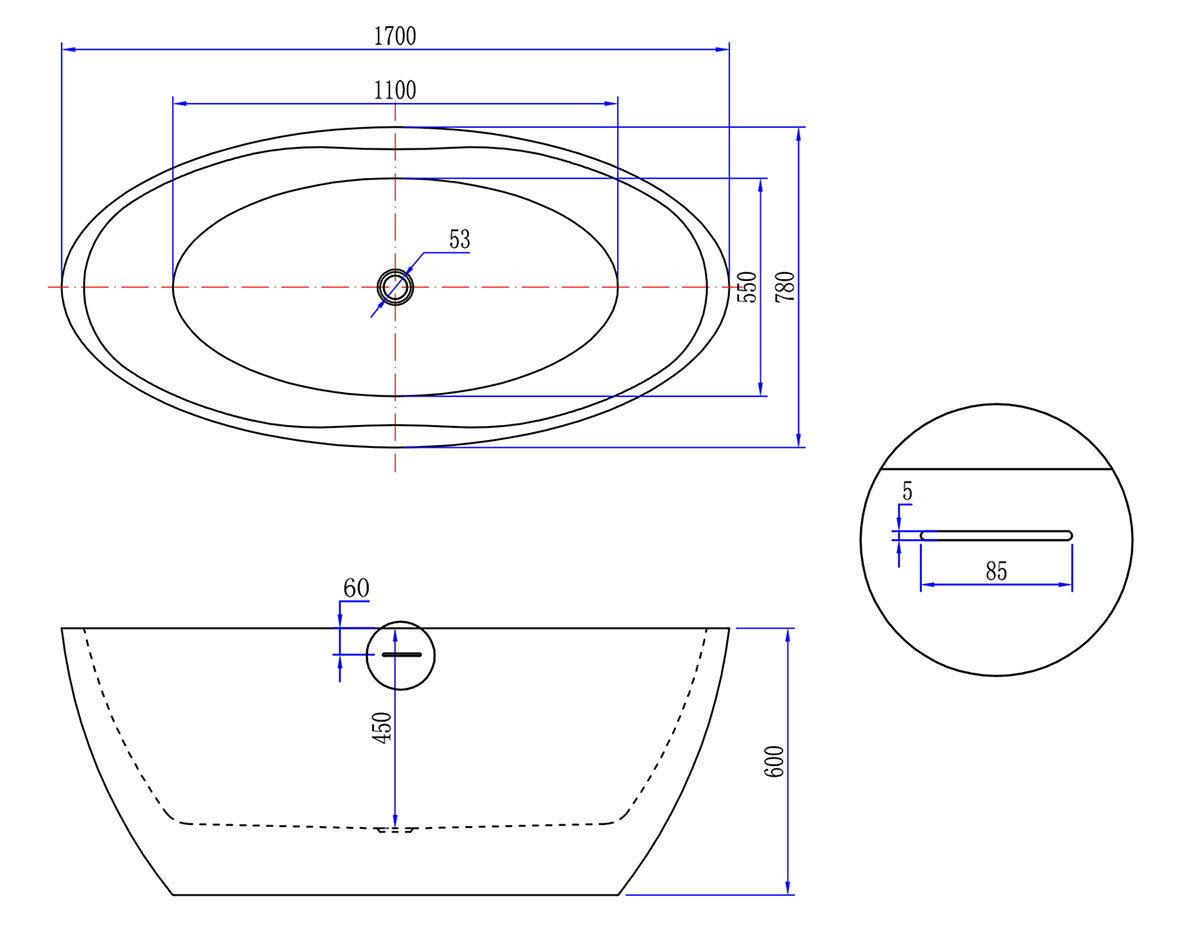 Oval vrijstaand ligbad 170 x 78 cm acryl mat wit - met waste mat wit