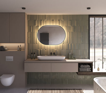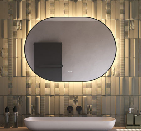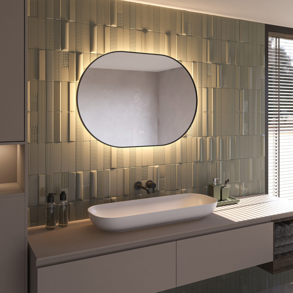 Deze trendy, ovale badkamerspiegel met zwart frame heeft een breedte van 100 cm en een hoogte van 70 cm. De verlichting is qua sterkte en lichtkleur instelbaar en schijnt rondom vanachter de spiegel over de wand en het wastafelmeubel.