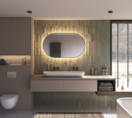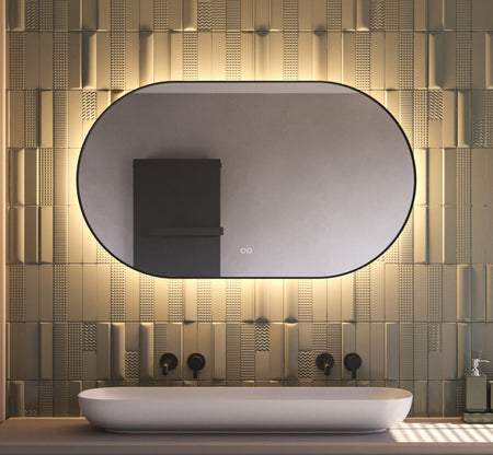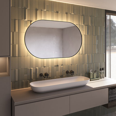 Deze trendy, ovale badkamerspiegel met zwart frame heeft een breedte van 120 cm en een hoogte van 70 cm. De verlichting is qua sterkte en lichtkleur instelbaar en schijnt rondom vanachter de spiegel over de wand en het wastafelmeubel.